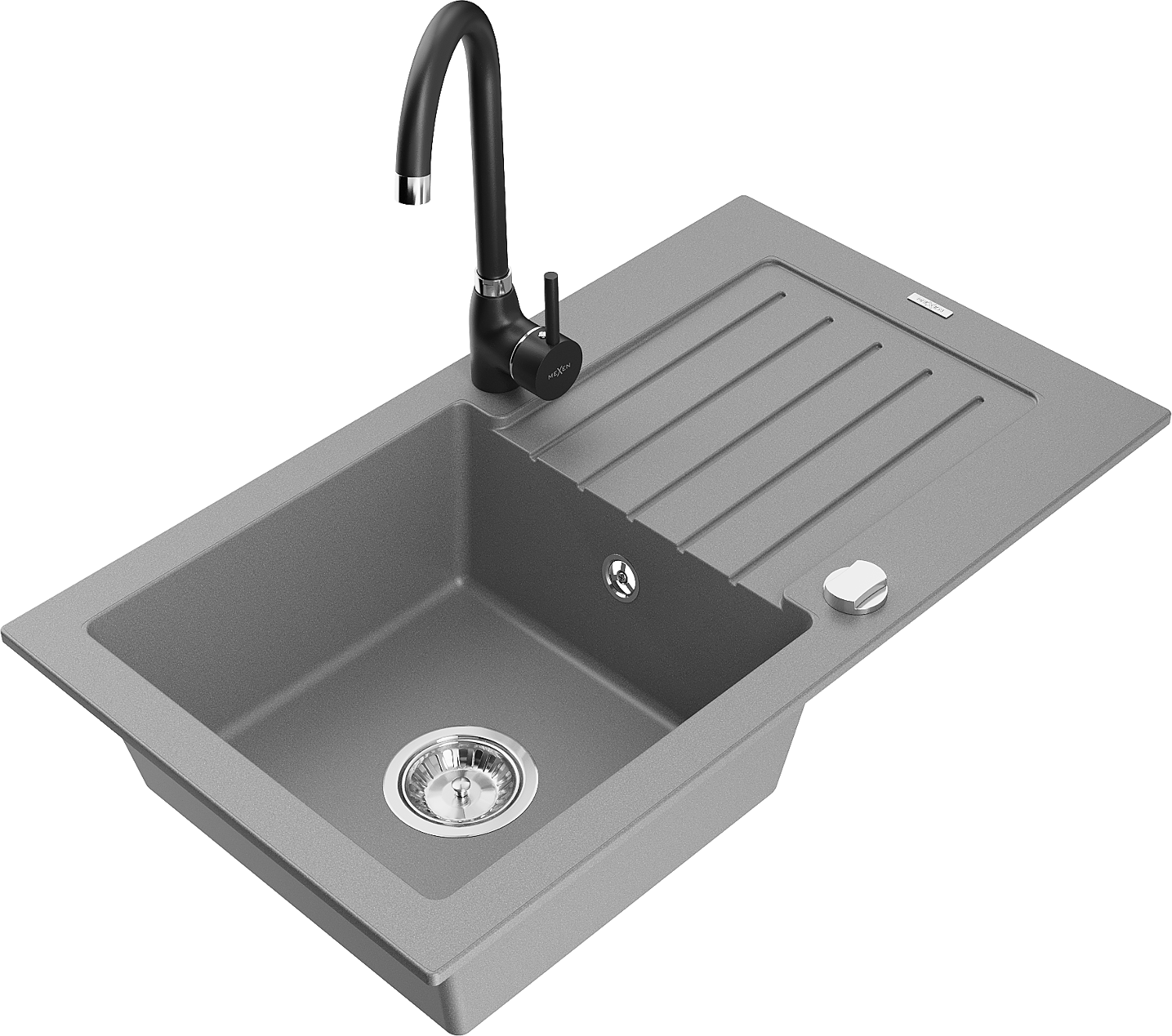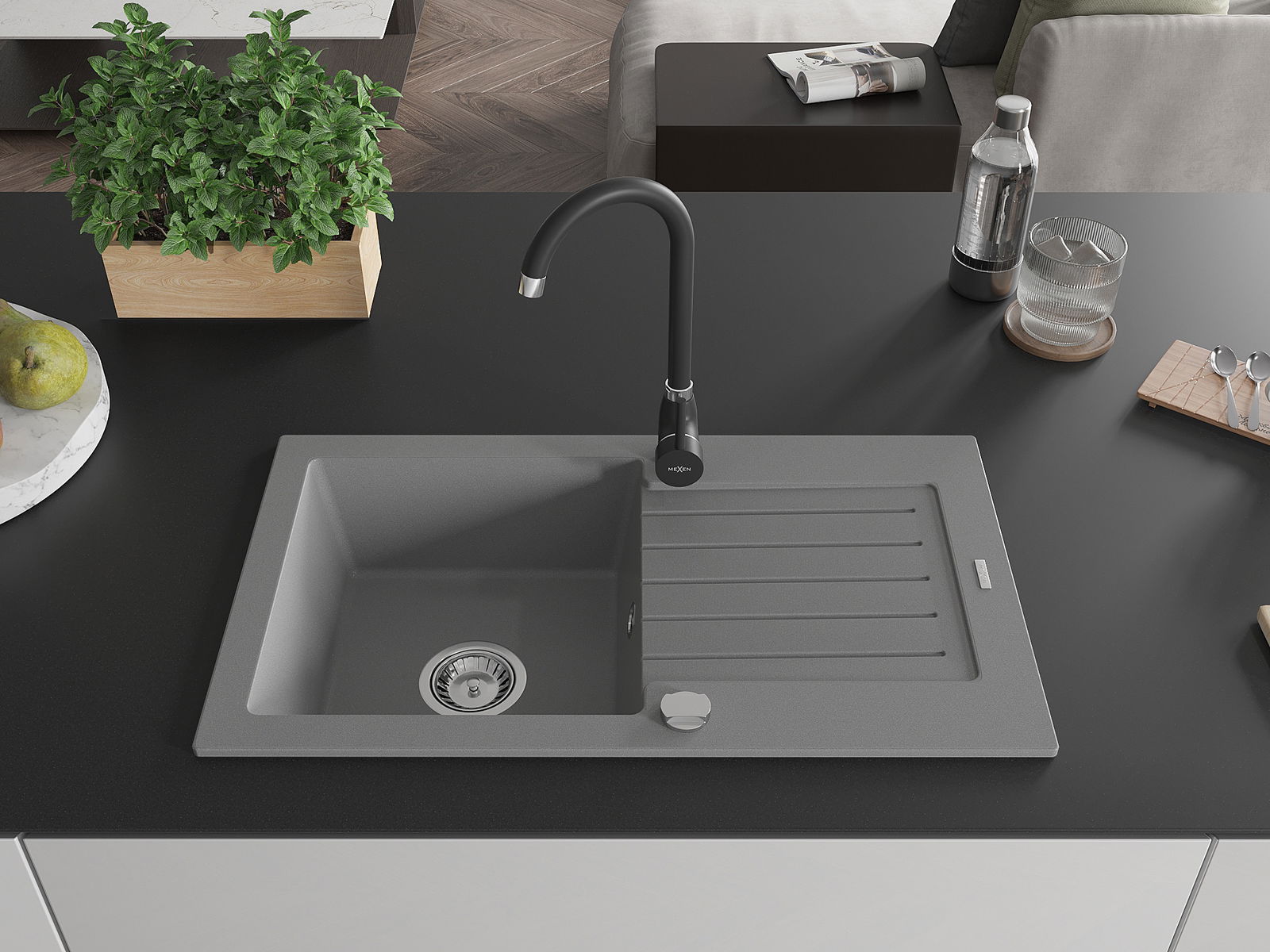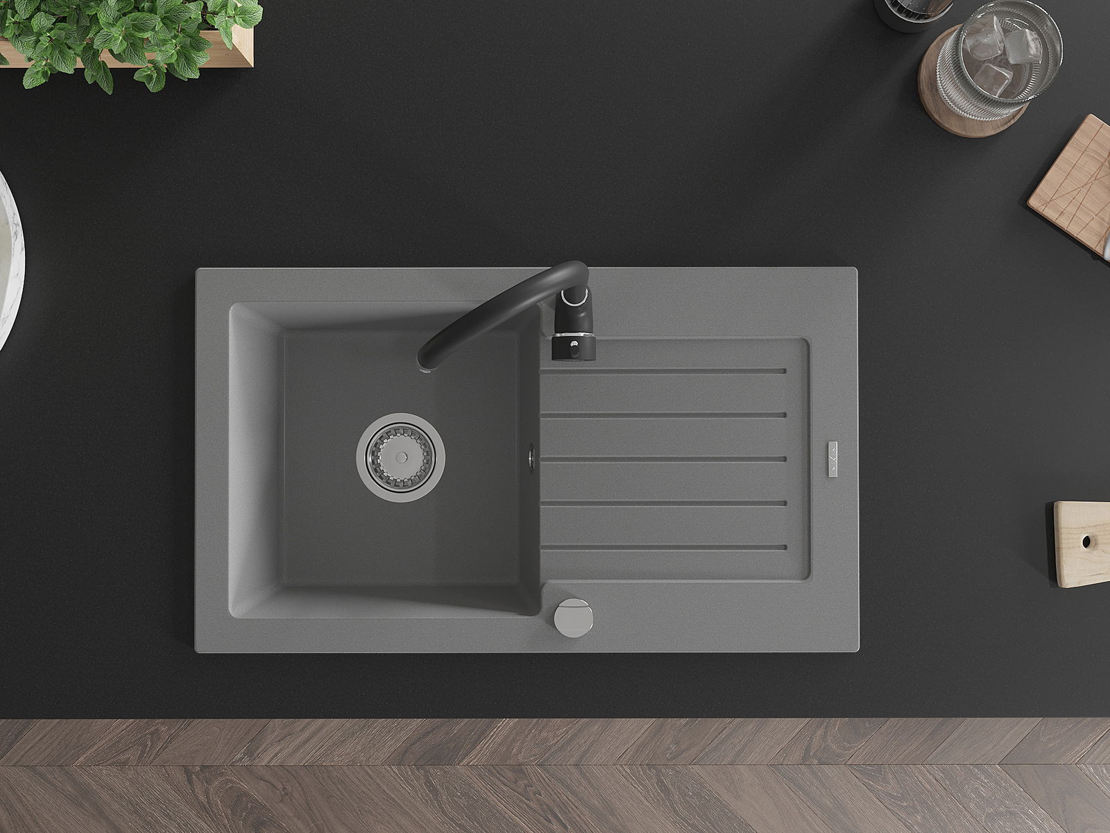 Mexen Pablo dřez granitový 1-komorový s odkapávačem a kuchyňskou baterií Telma, šedý - 6510-71-670200-70