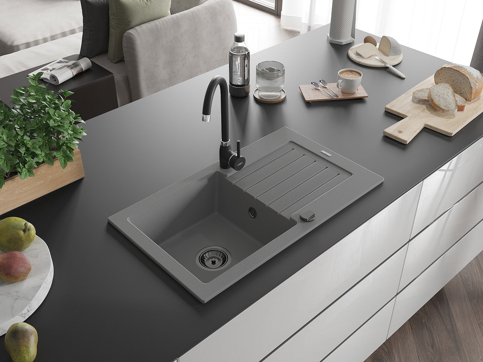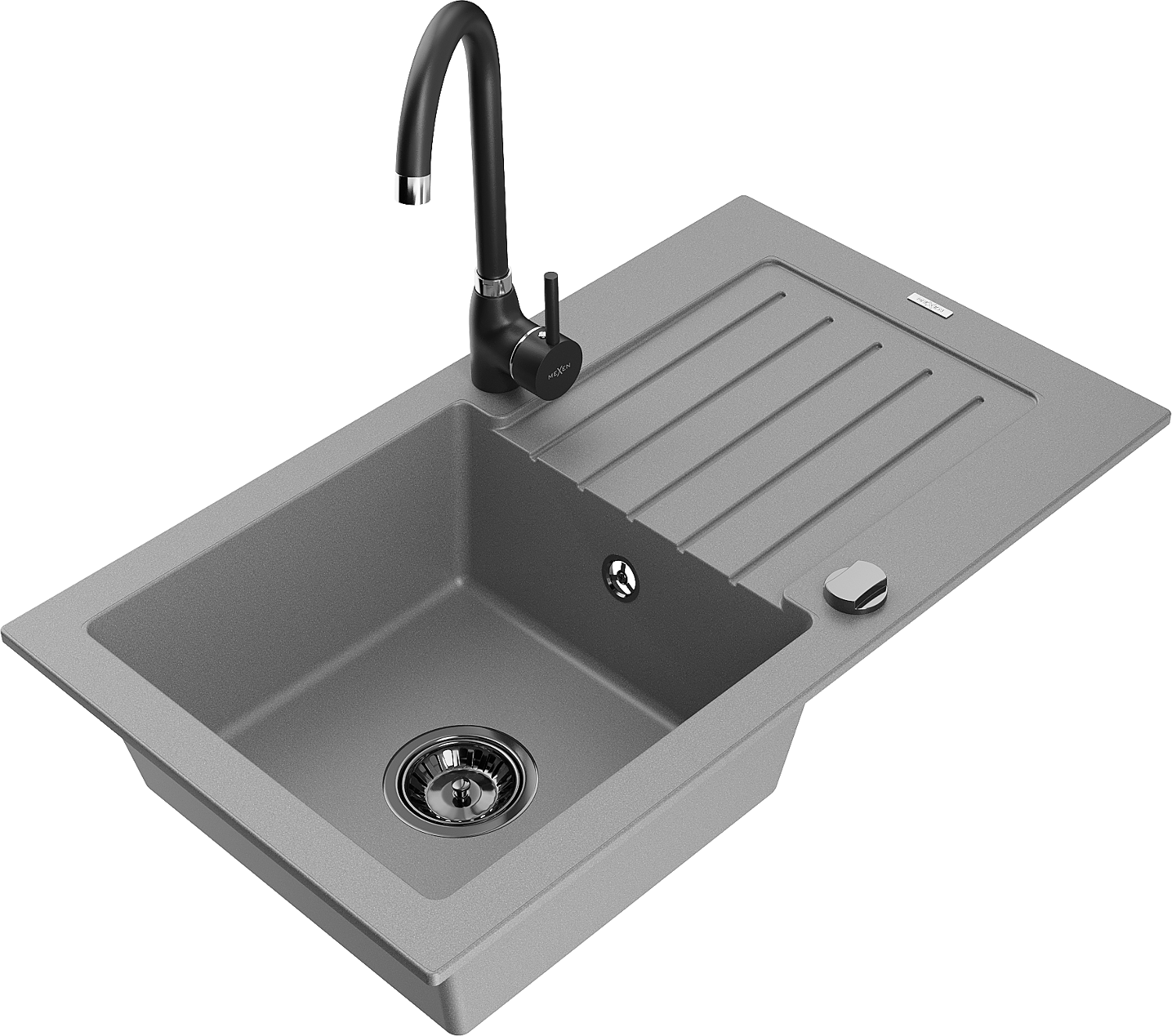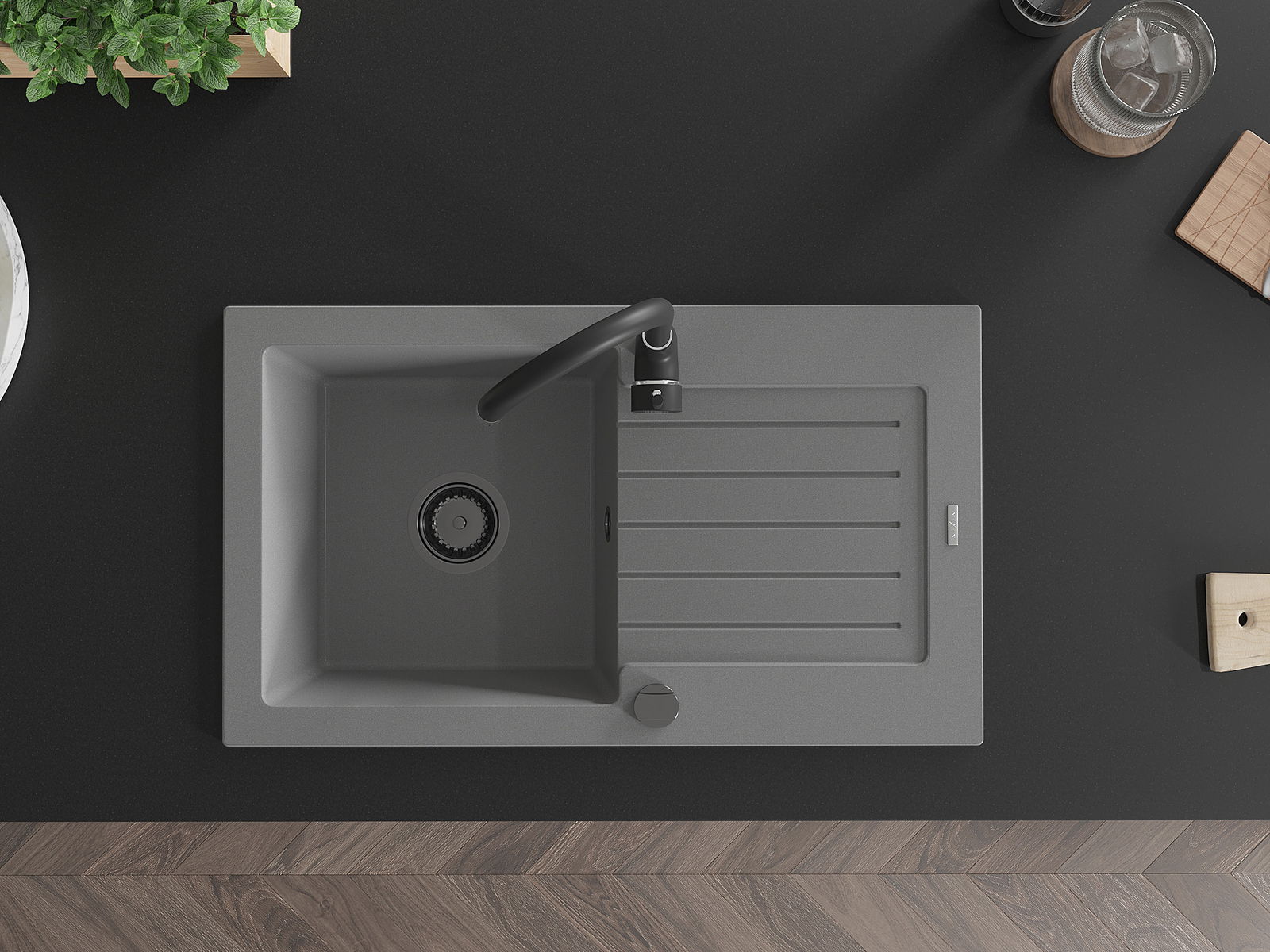 Mexen Pablo granitový dřez s 1 komorou, odkapávačem a kuchyňskou baterií Telma, šedý - 6510-71-670200-70-B