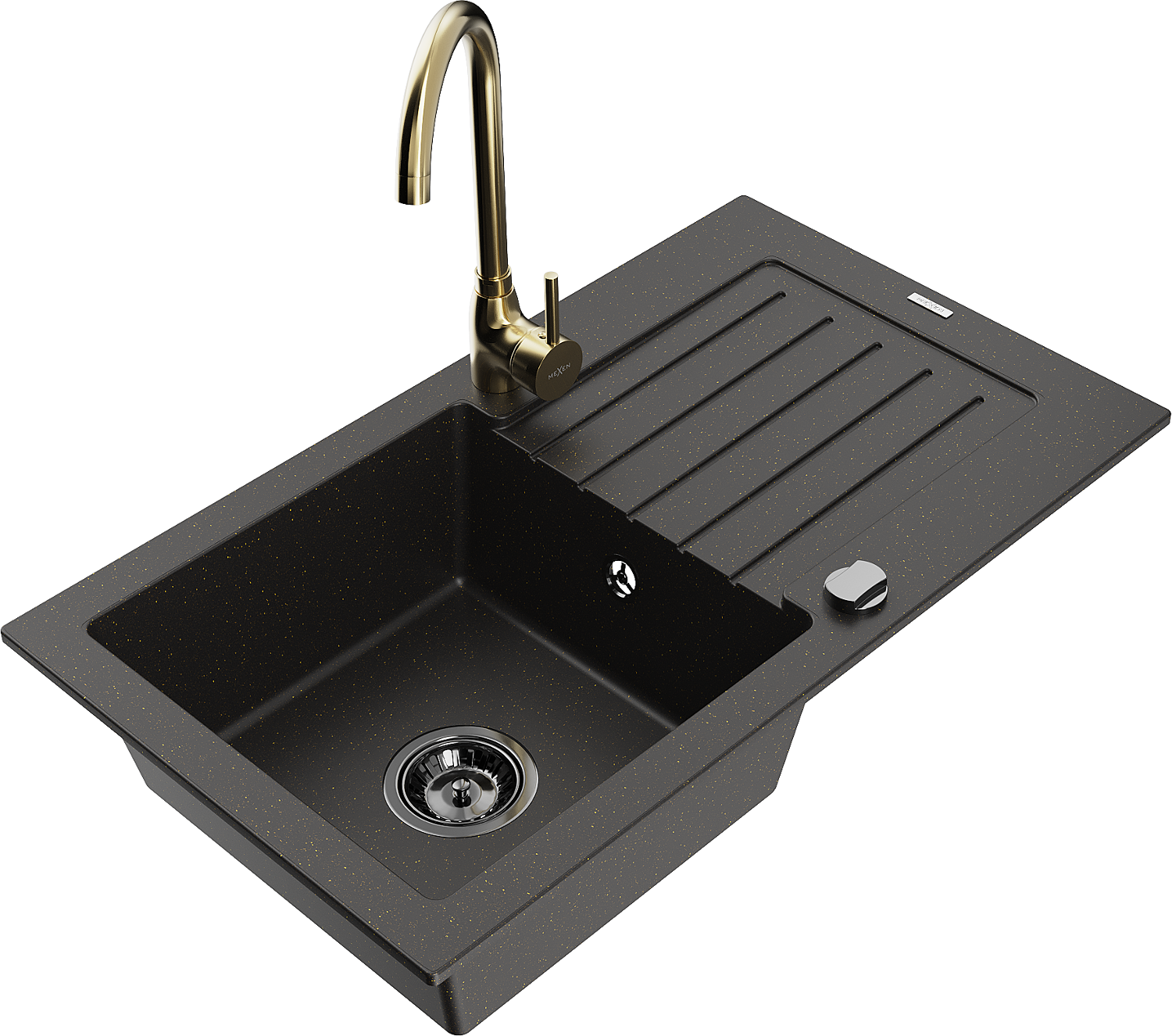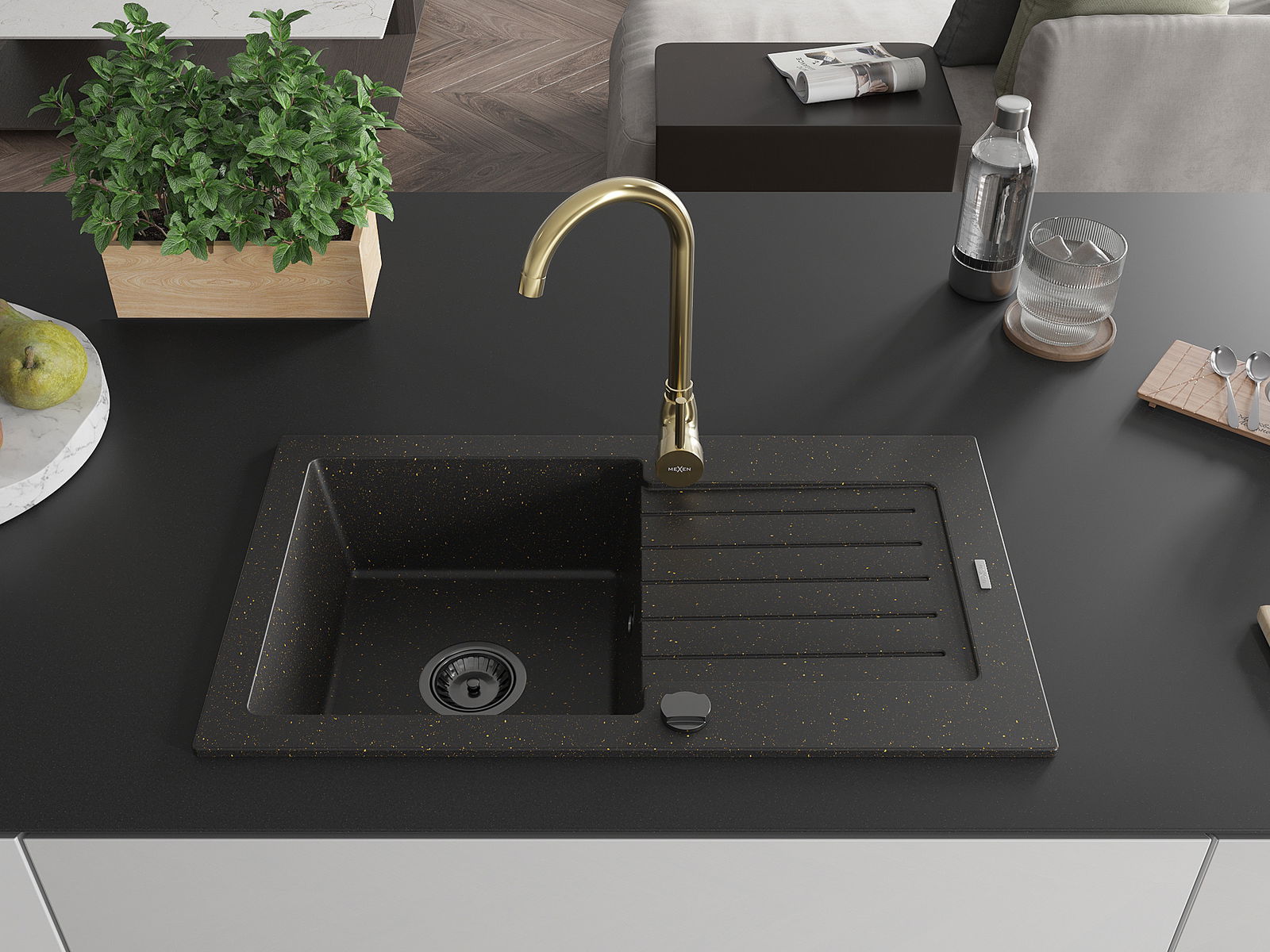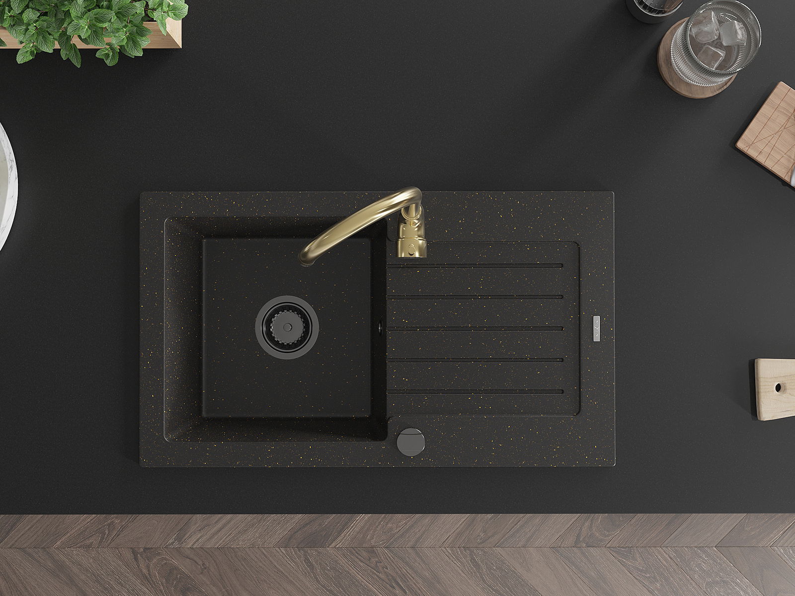 Mexen Pablo žulový dřez 1-komorový s odkapávačem a kuchyňskou baterií Telma, černý/zlatý - 6510-75-670200-50-B