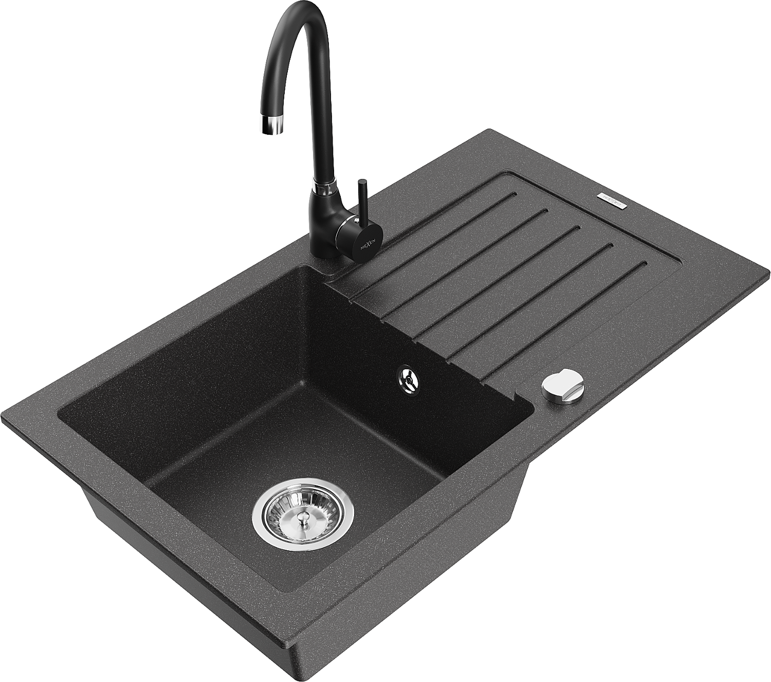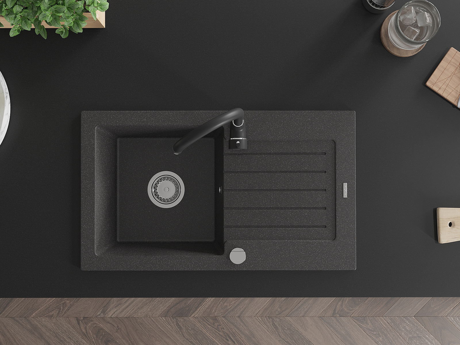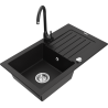 Mexen Pablo granitový dřez 1-komorový s odkapávačem a kuchyňskou baterií Telma, černý skvrnitý - 6510-76-670200-70