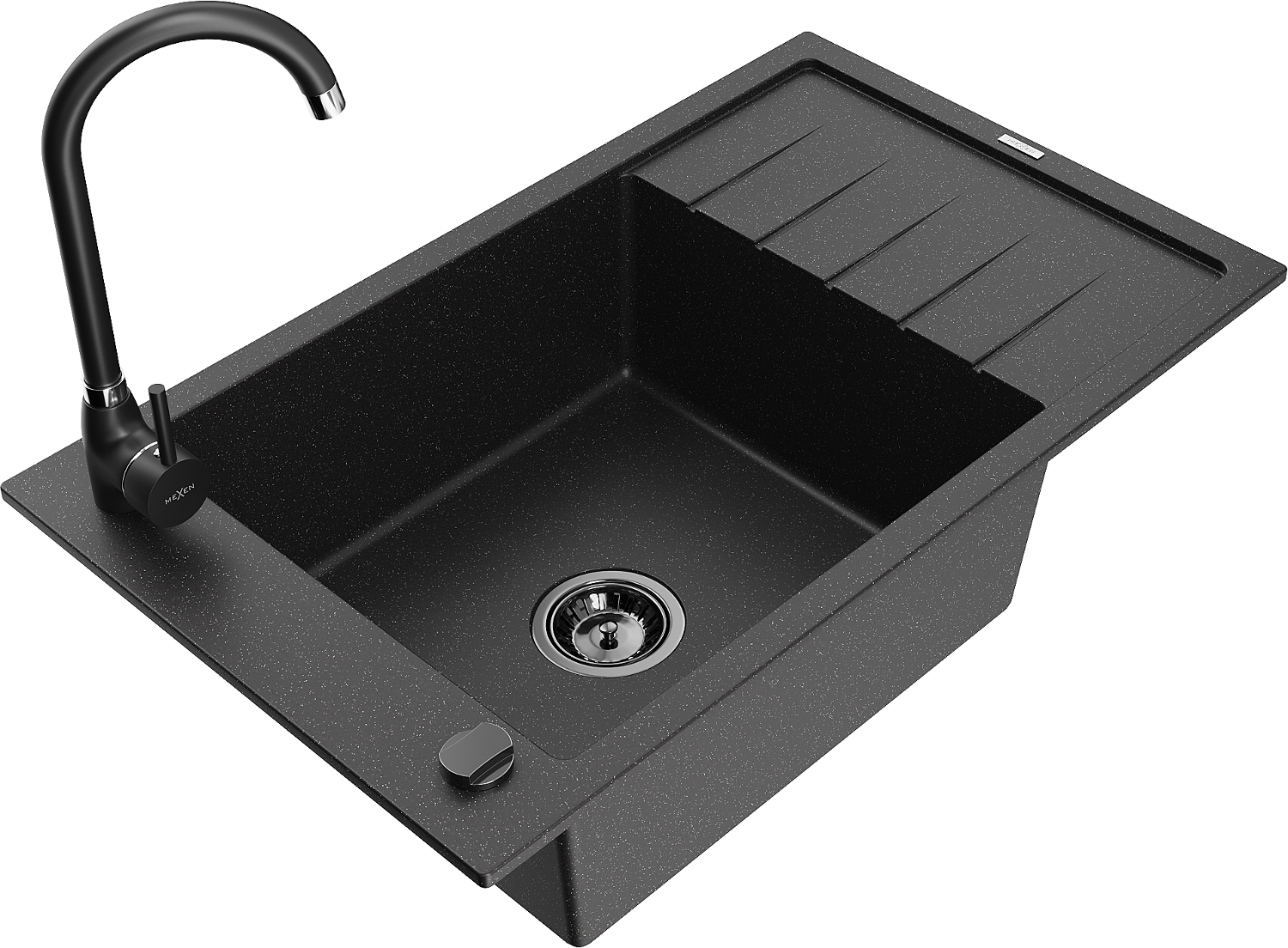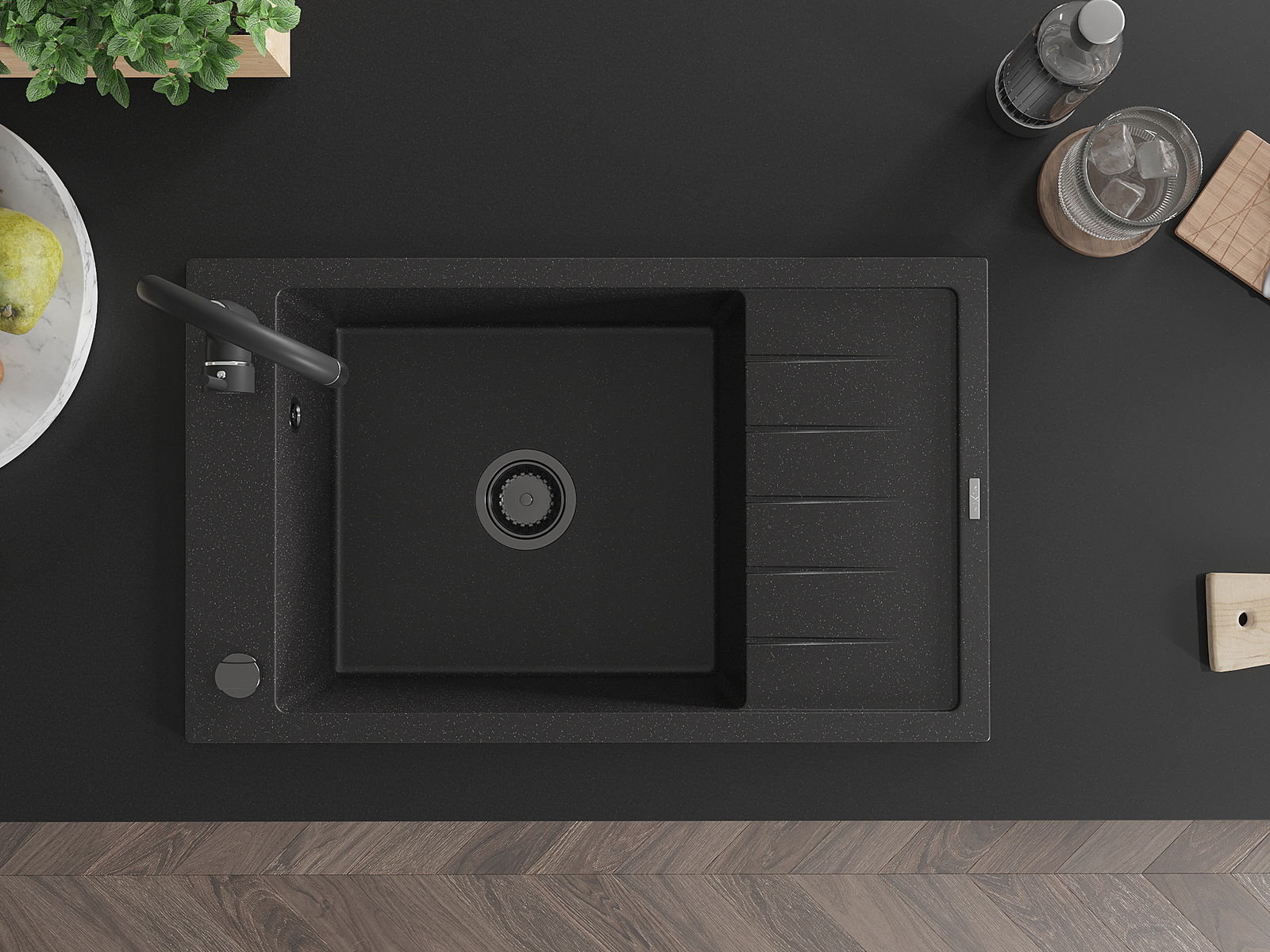 Mexen Elias granitový dřez s 1 komorou, odkapávačem a kuchyňskou baterií Telma, černý/stříbrný - 6511-73-670200-70-B