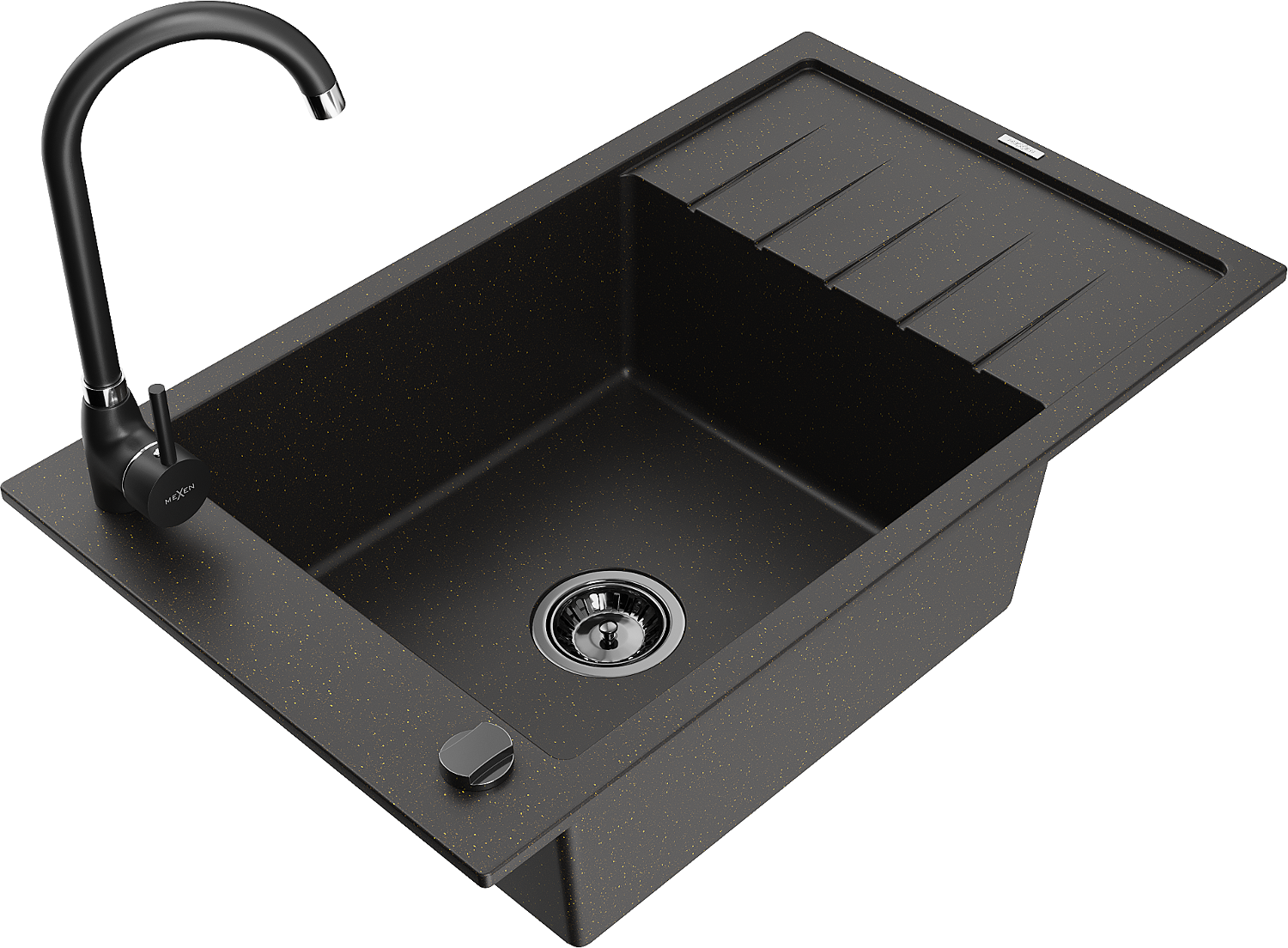 Mexen Elias granitový dřez 1-komorový s odkapávačem a kuchyňskou baterií Telma, černý/zlatý - 6511-75-670200-70-B