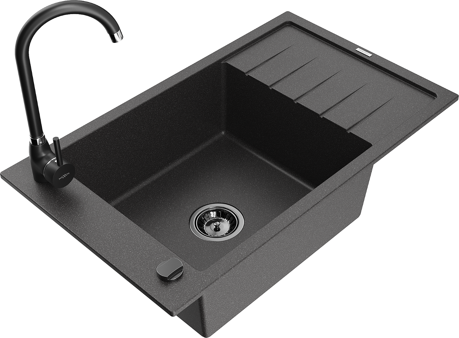 Mexen Elias granitový dřez 1-komorový s odkapávačem a kuchyňskou baterií Telma, černý tečkovaný - 6511-76-670200-70-B