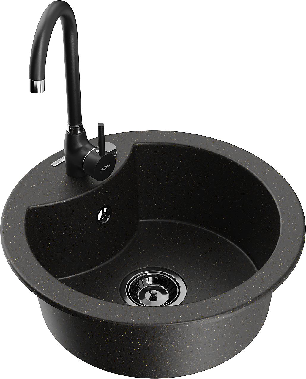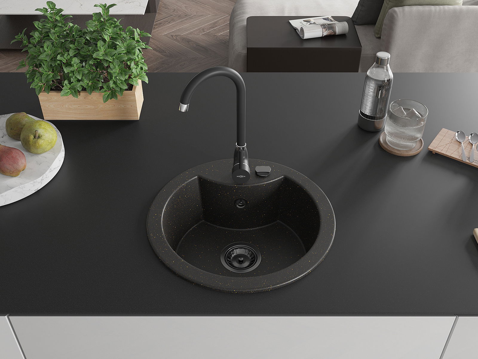 Mexen Diego granitový dřez 1-komorový s kuchyňskou baterií Telma, černá/zlatá - 6512-75-670200-70-B