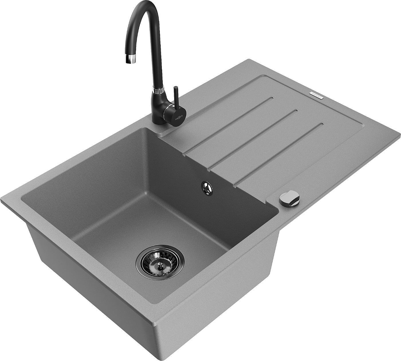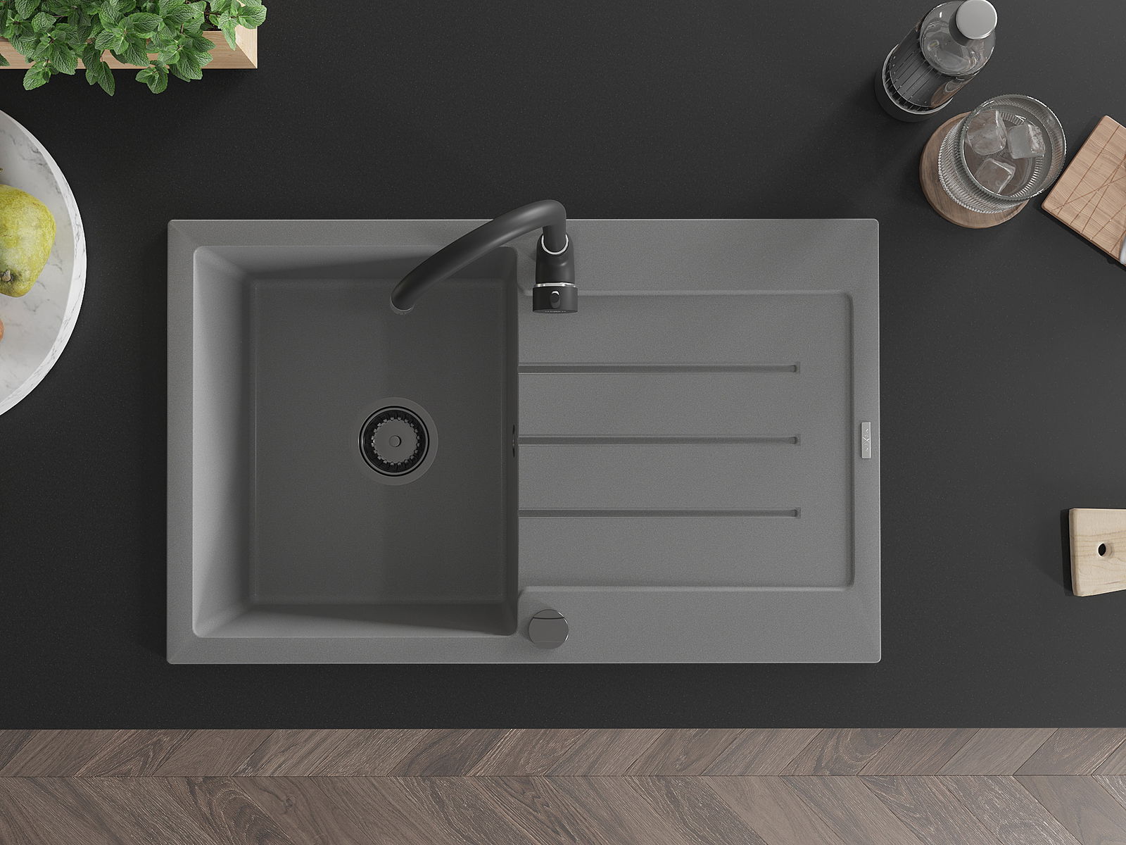 Mexen Bruno granitový dřez jednokomorový s odkapávačem a kuchyňskou baterií Telma, šedý - 6513-71-670200-70-B