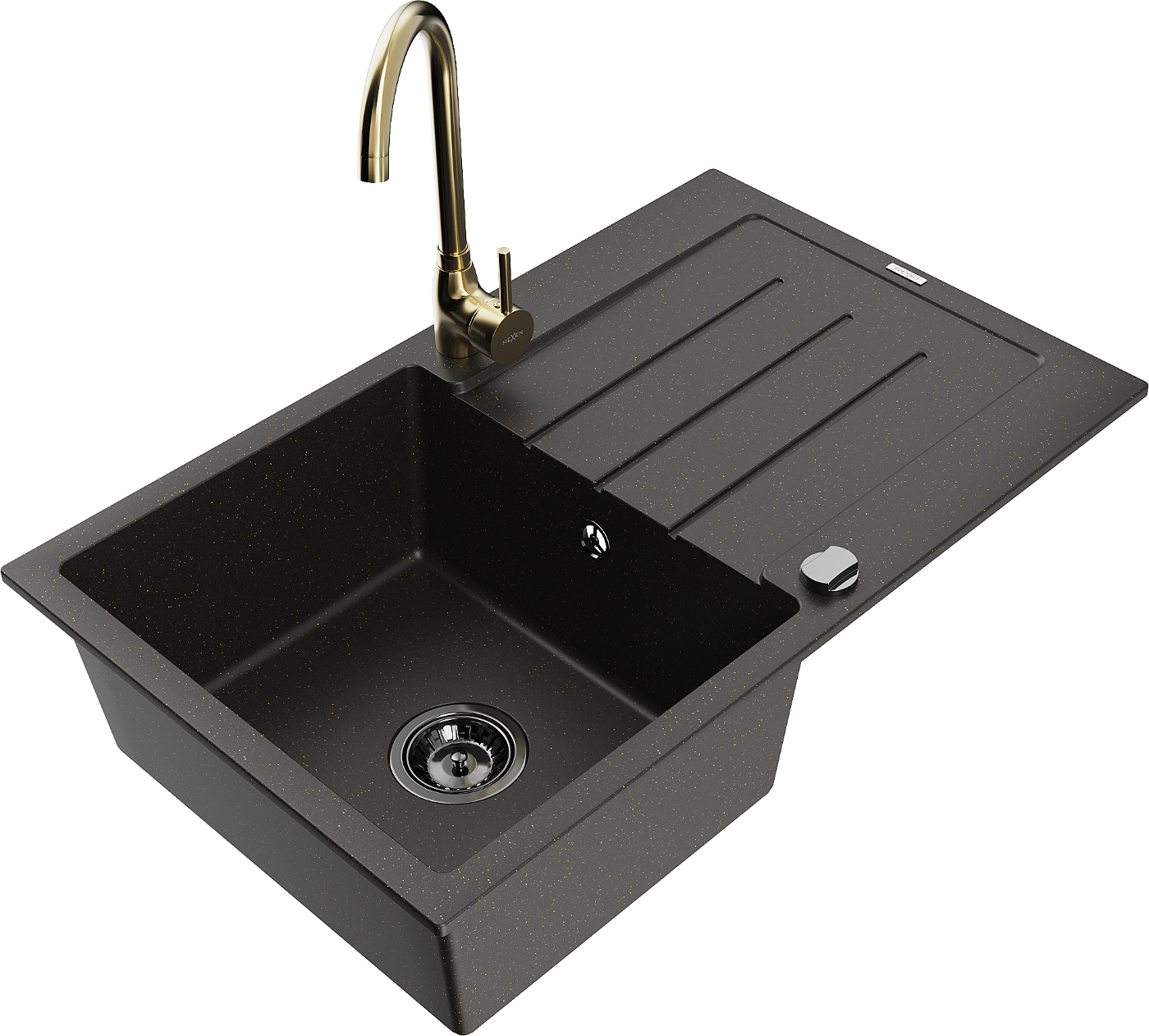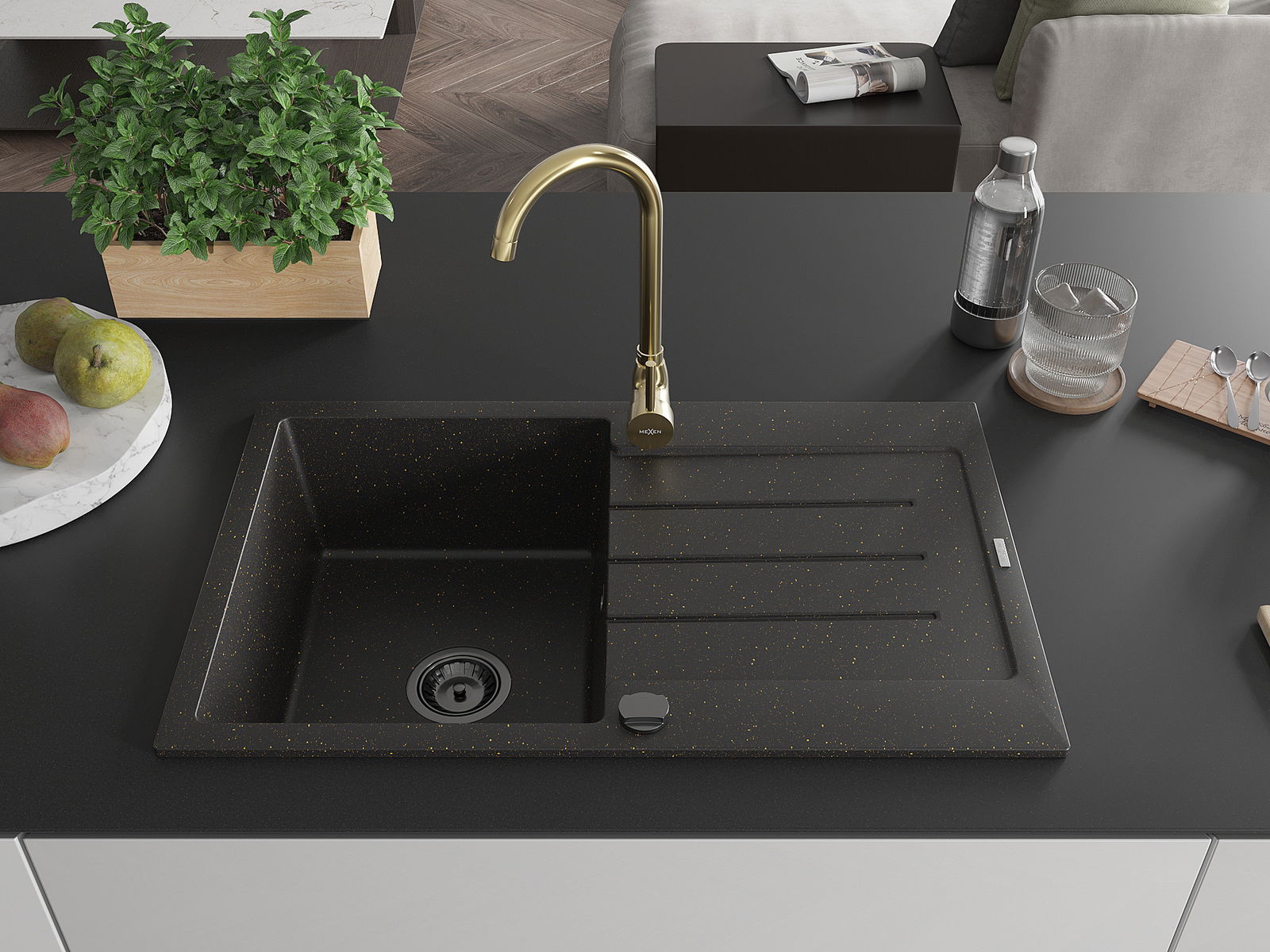 Mexen Bruno granitový dřez 1-komorový s odkapávačem a kuchyňskou baterií Telma, černý/zlatý - 6513-75-670200-50-B