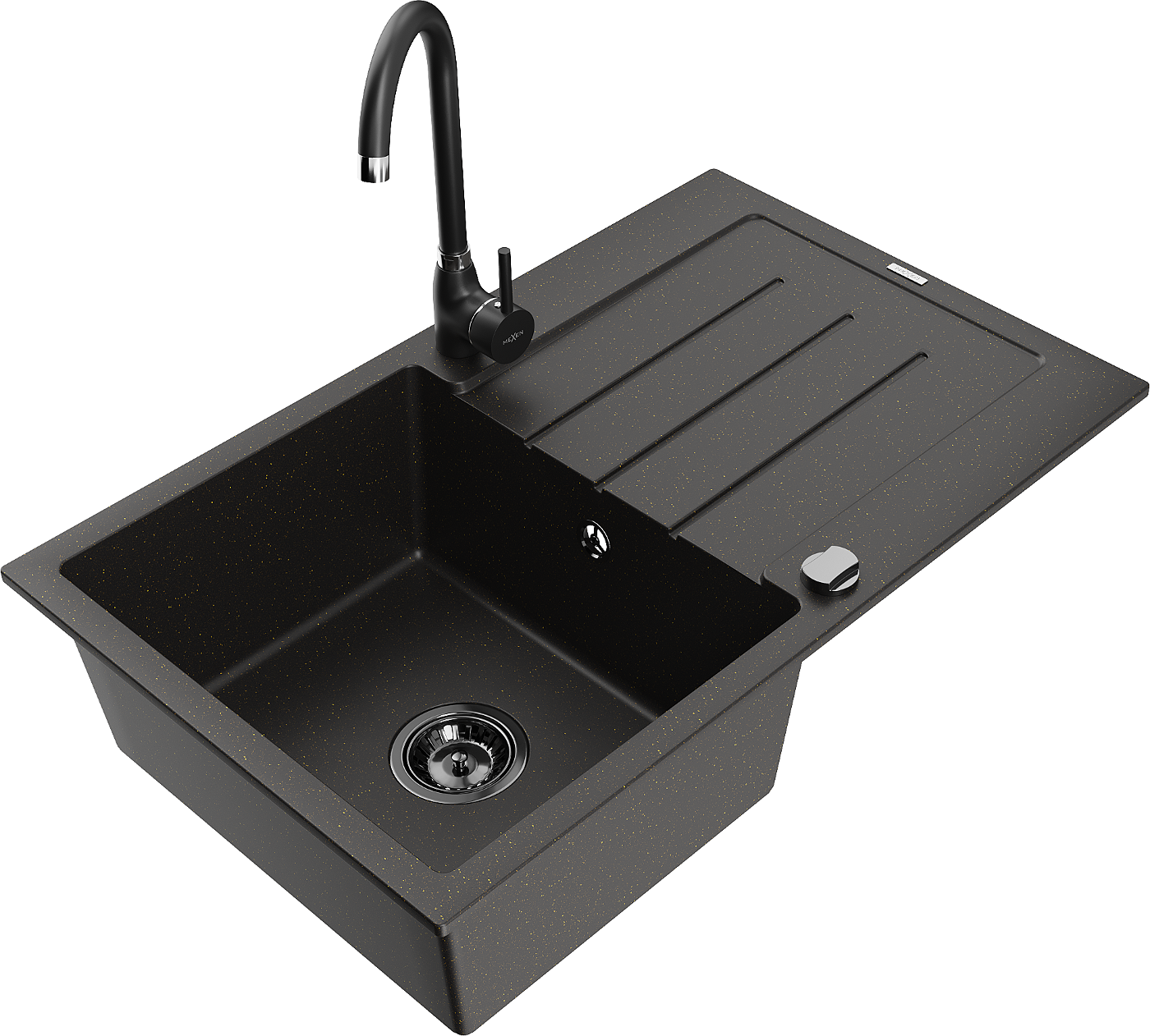 Mexen Bruno granitový kuchyňský dřez 1-komorový s odkapávačem a kuchyňskou baterií Telma, černá/zlatá - 6513-75-670200-70-B
