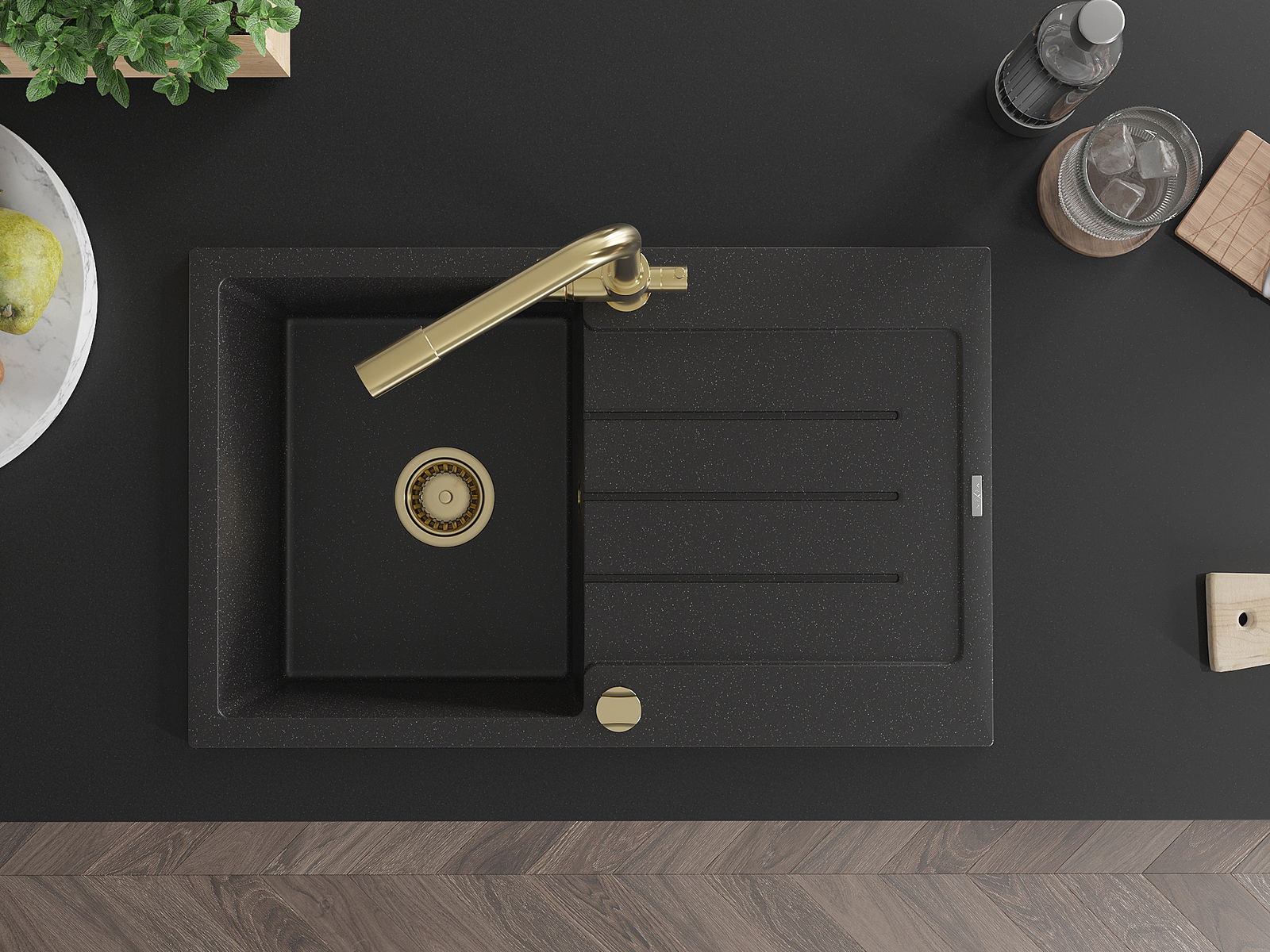 Mexen Bruno granitový dřez 1-komorový s odkapávačem a kuchyňskou baterií Duero, černý/stříbrný metalik - 6513-73-671600-50