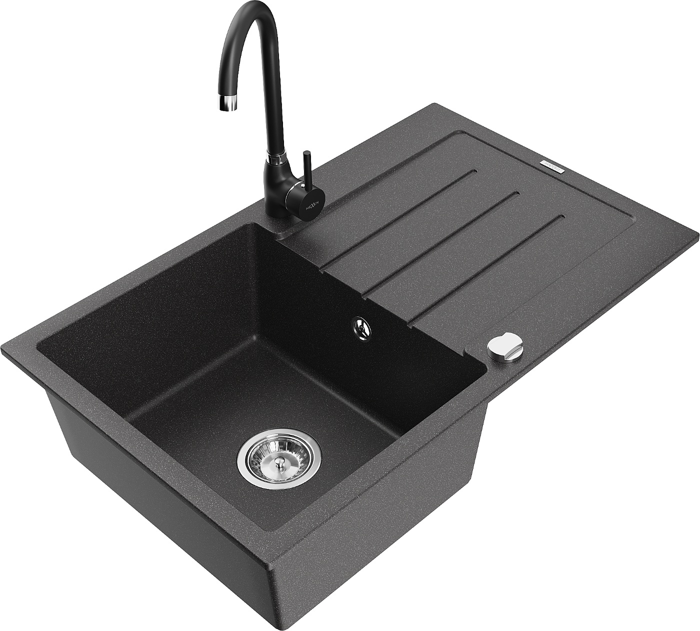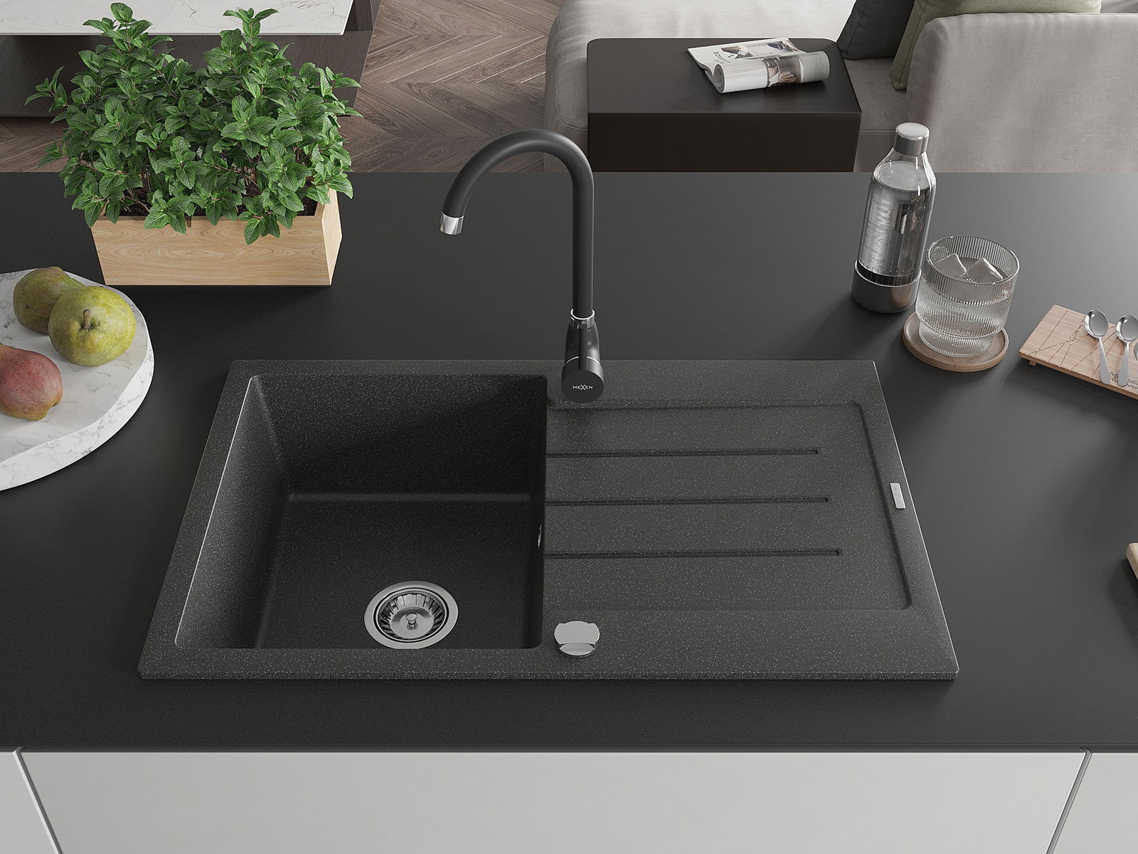 Mexen Bruno granitový dřez 1-komorový s odkapávačem a kuchyňskou baterií Telma, černý skvrnitý - 6513-76-670200-70