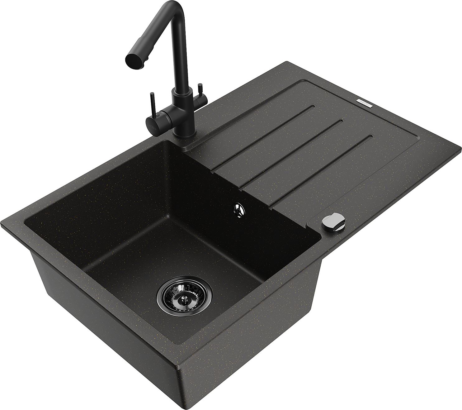 Mexen Bruno granitový dřez 1-komorový s odkapávačem a kuchyňskou baterií Duero, černý/zlatý metalik - 6513-75-671600-70-B