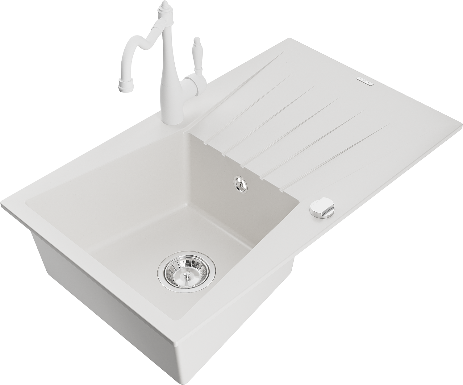 Mexen Cesar granitový dřez 1-komorový s odkapávačem a kuchyňskou baterií Carla, bílý - 6514-20-670700-20