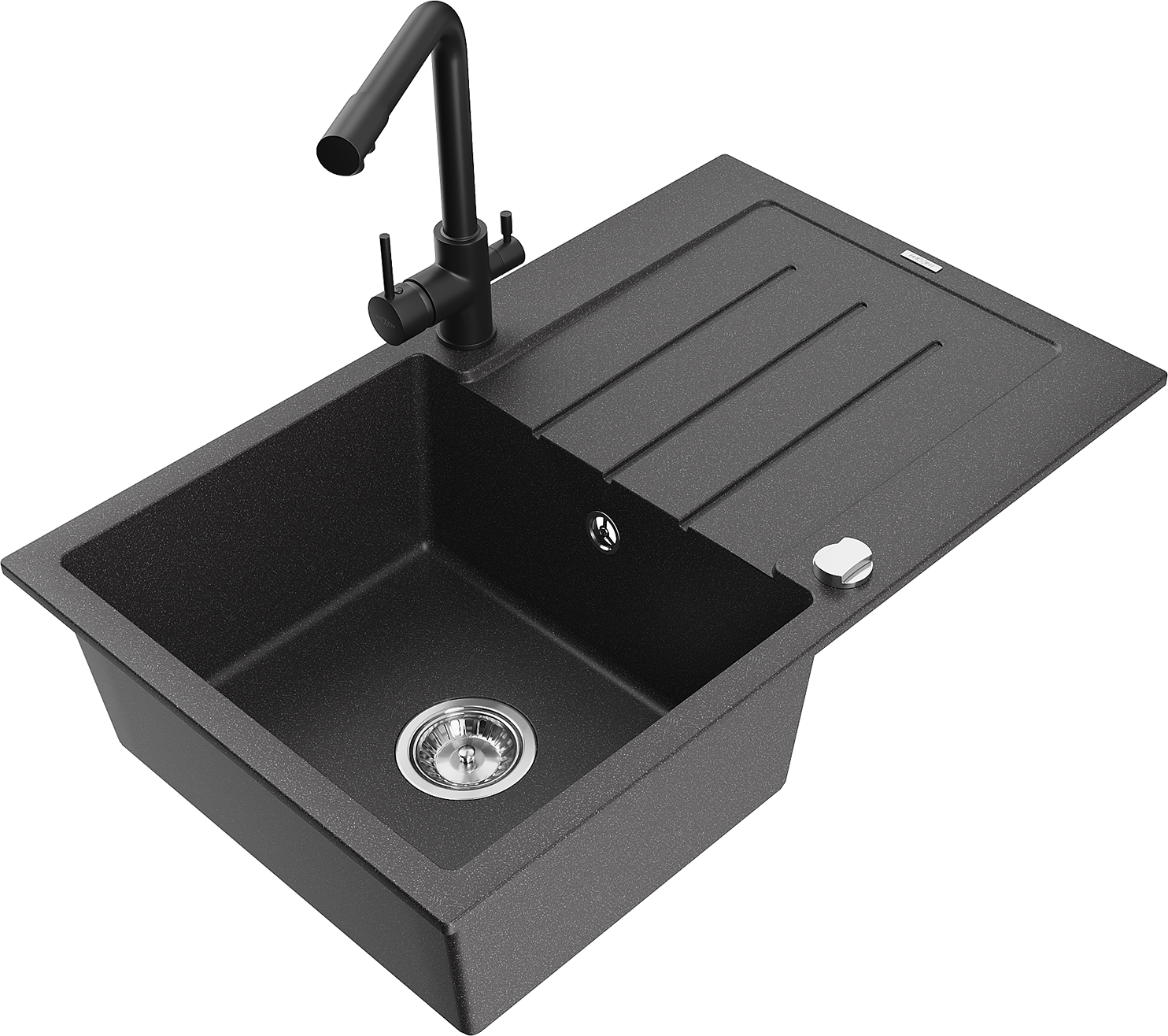 Mexen Bruno granitový dřez 1-komorový s odkapávačem a kuchyňskou baterií Duero, černý skvrnitý - 6513-76-671600-70
