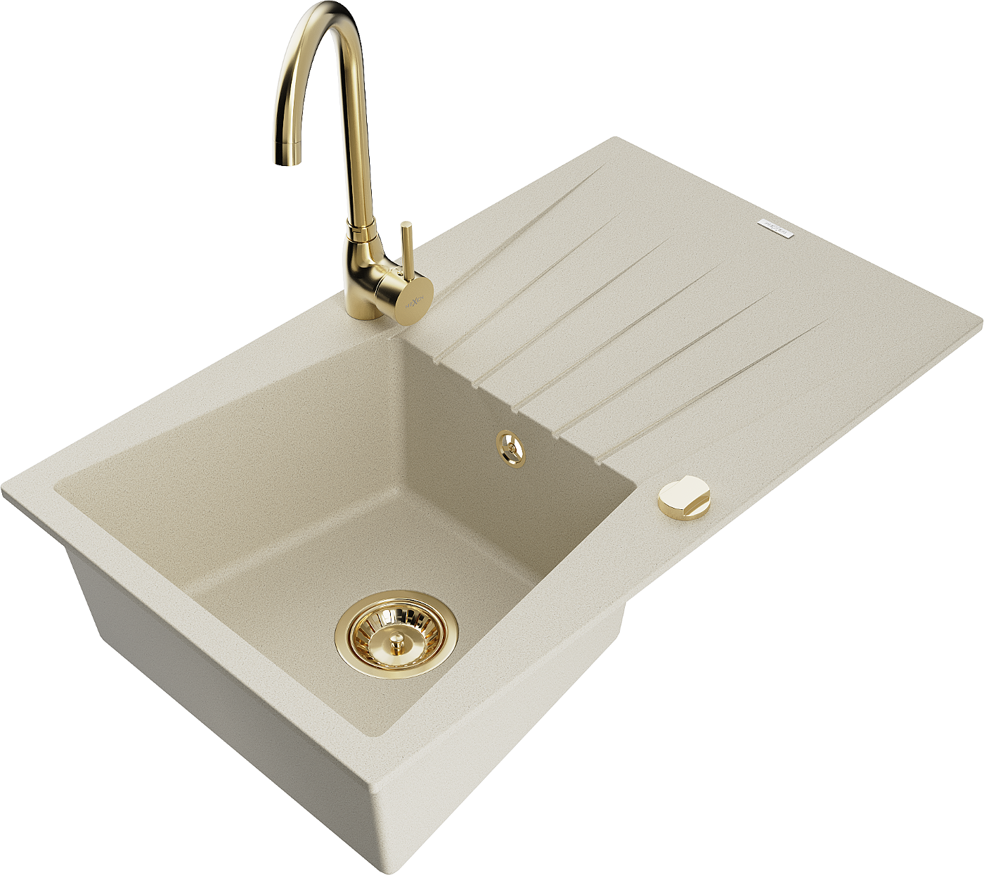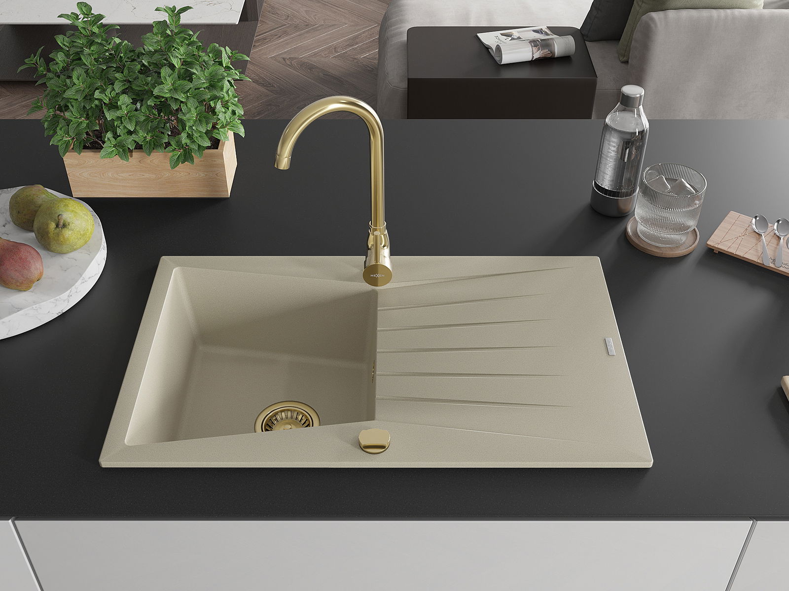 Mexen Cesar granitový dřez 1-komorový s odkapávačem a kuchyňskou baterií Telma, béžový - 6514-69-670200-50