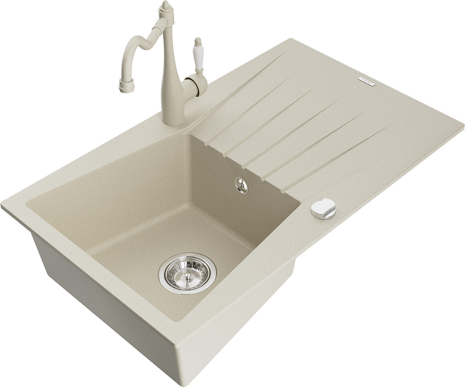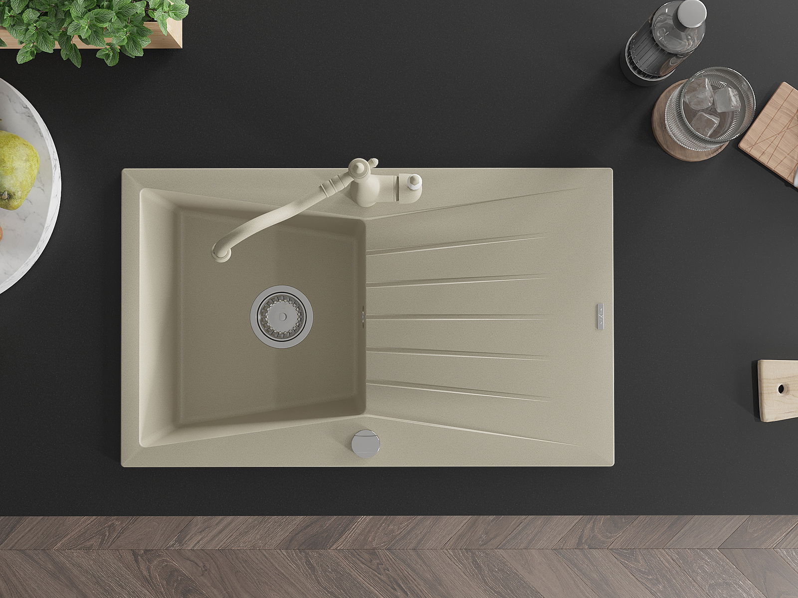 Mexen Cesar kuchyňský dřez z granitu s 1 komorou, s odkapávačem a kuchyňskou baterií Carla, béžová - 6514-69-670700-69