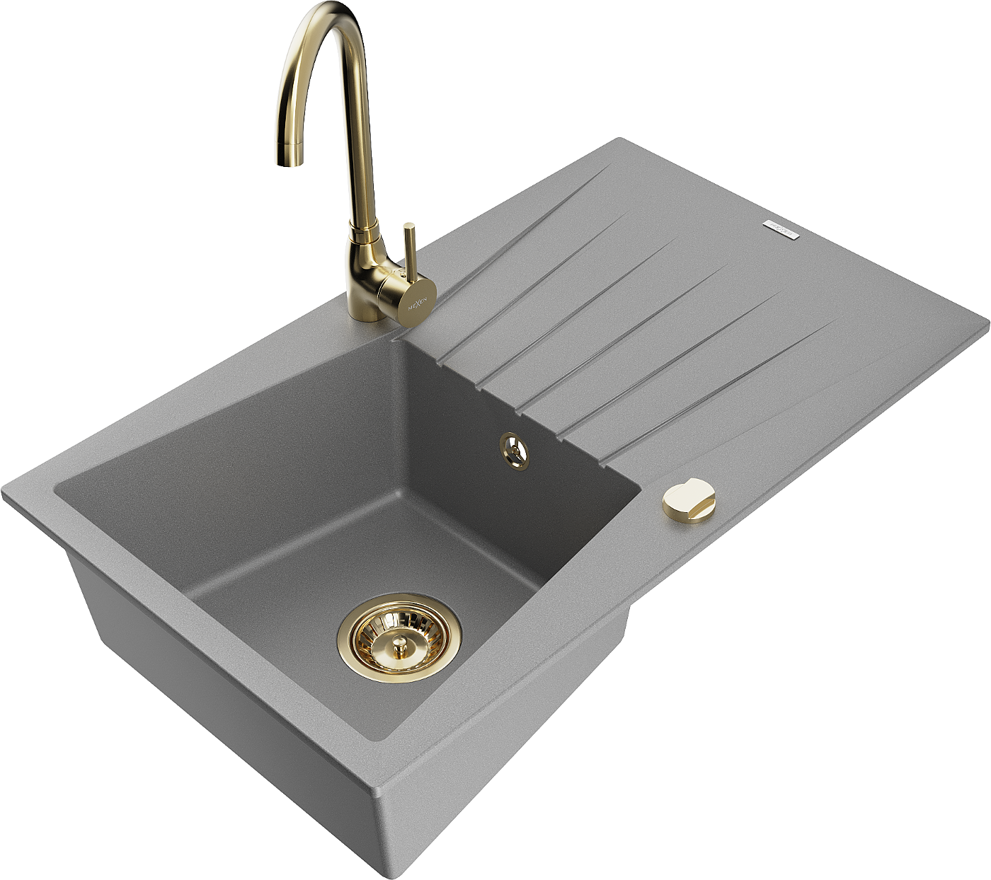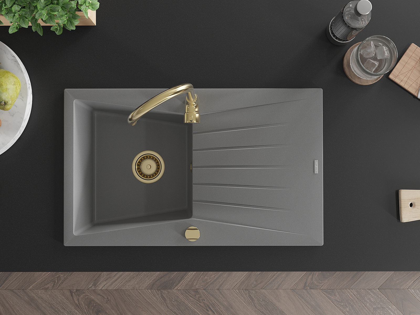 Mexen Cesar žulový dřez 1-komorový s odkapávačem a kuchyňskou baterií Telma, šedý - 6514-71-670200-50