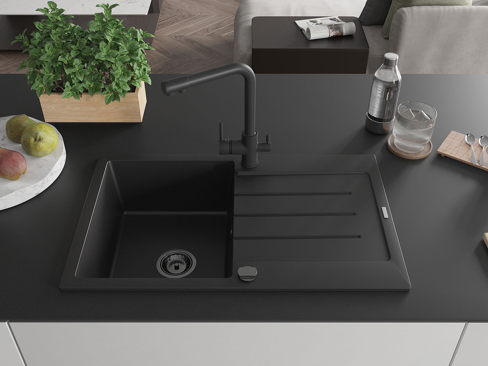 Mexen Bruno granitový dřez 1-komorový s odkapávačem a kuchyňskou baterií Duero, černý - 6513-77-671600-70-B