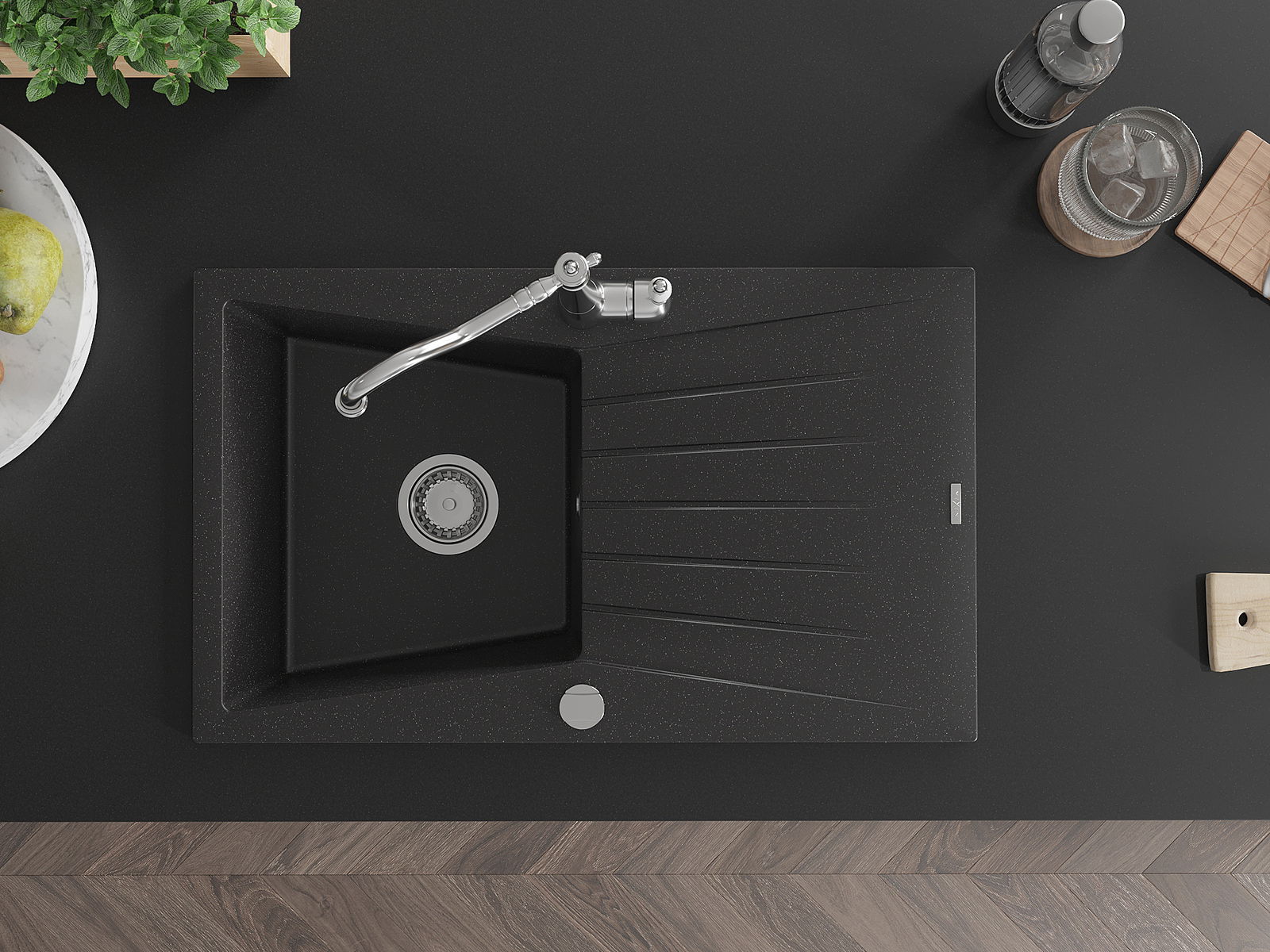 Mexen Cesar granitový dřez jednodřez s odkapávací plochou a kuchyňská baterie Carla, černý/stříbrný metalik - 6514-73-670700-00