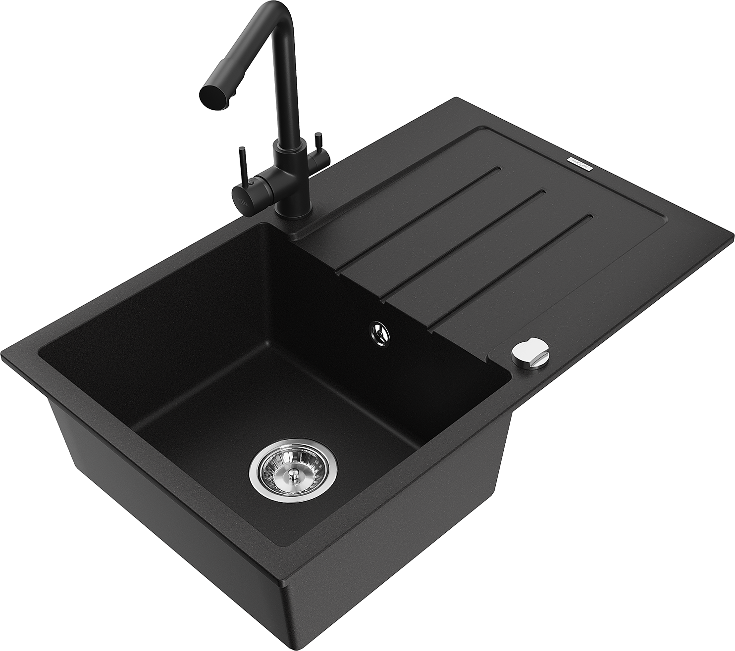 Mexen Bruno žulový dřez s jednou komorou a odkapávačem a kuchyňskou baterií Duero, černá - 6513-77-671600-70
