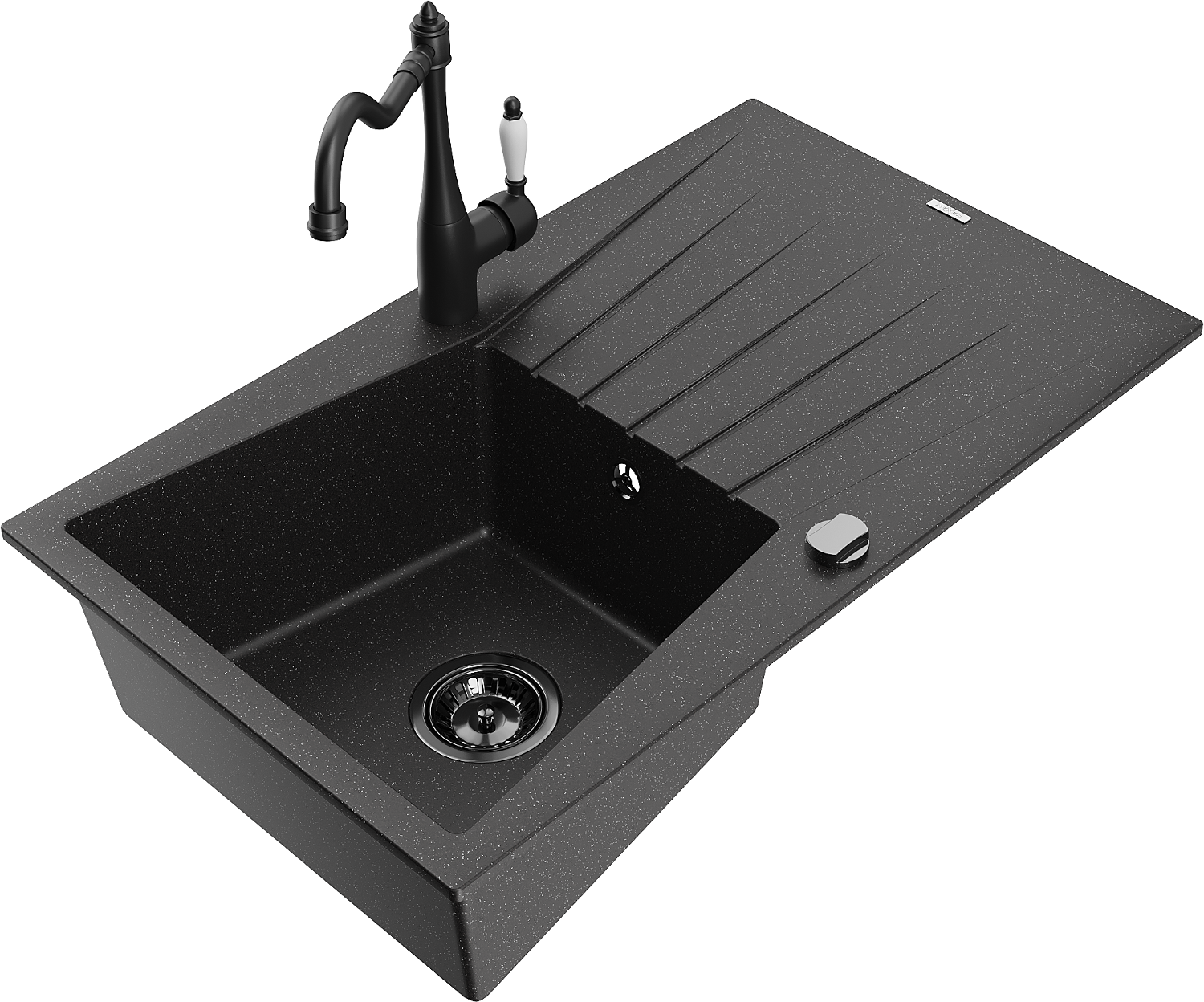 Mexen Cesar granitový dřez 1-komorový s odkapávačem a kuchyňskou baterií Carla, černý/stříbrný metalik - 6514-73-670700-70-B