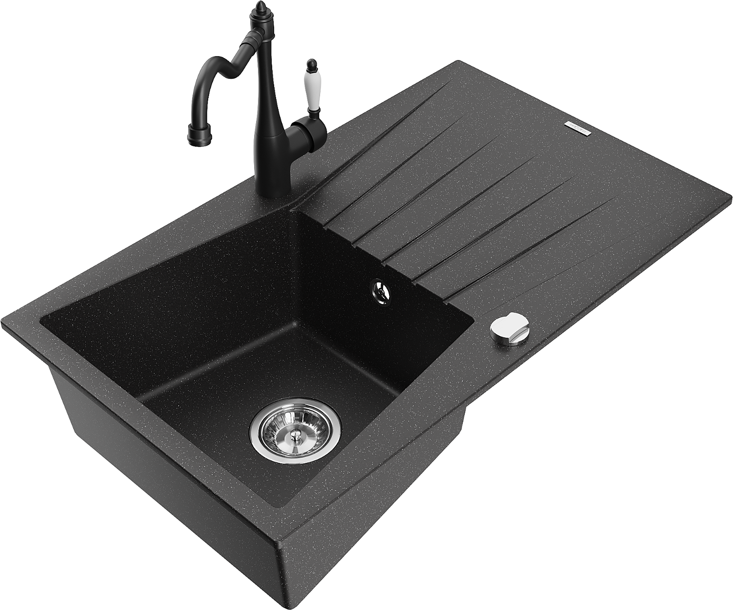 Mexen Cesar granitový dřez 1-komorový s odkapávačem a kuchyňskou baterií Carla, černý/stříbrný metalik - 6514-73-670700-70