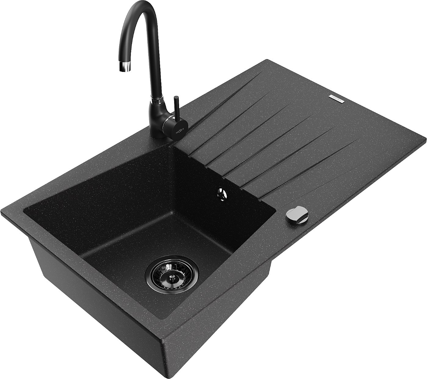 Mexen Cesar granitový dřez 1-komorový s odkapávačem a kuchyňskou baterií Telma, černý/stříbrný - 6514-73-670200-70-B