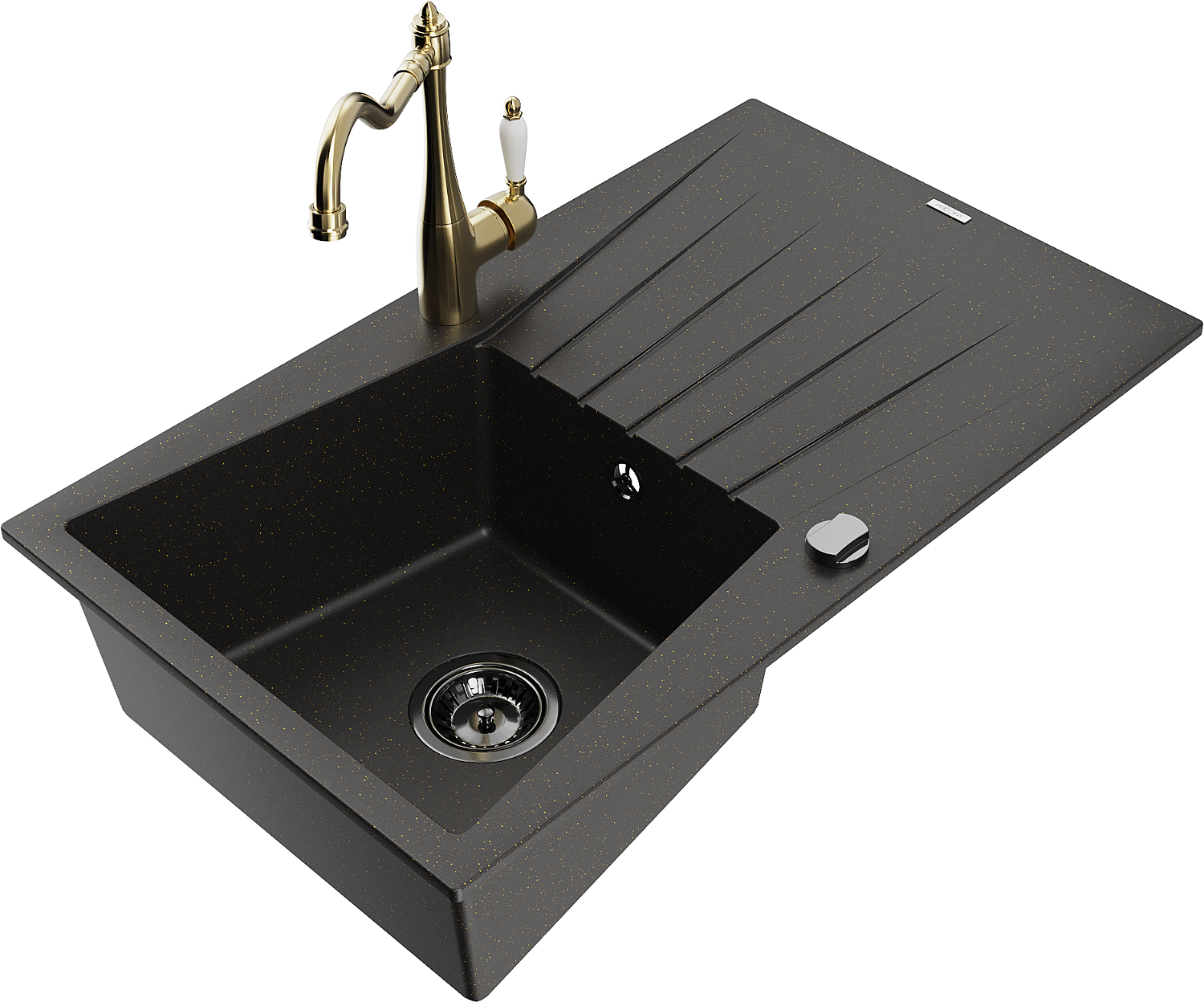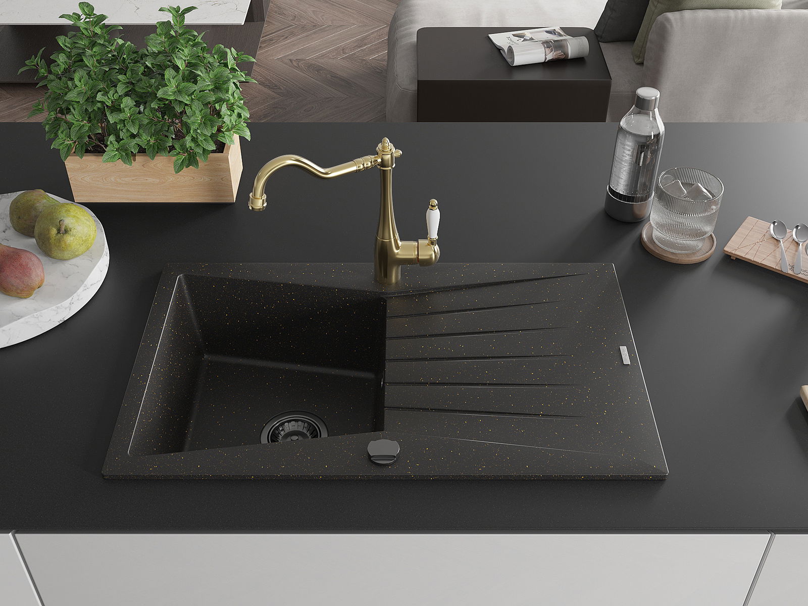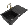 Mexen Cesar granitový dřez s jednou komorou a odkapávačem a kuchyňskou baterií Carla, černý/zlatý metalik - 6514-75-670700-50-B
