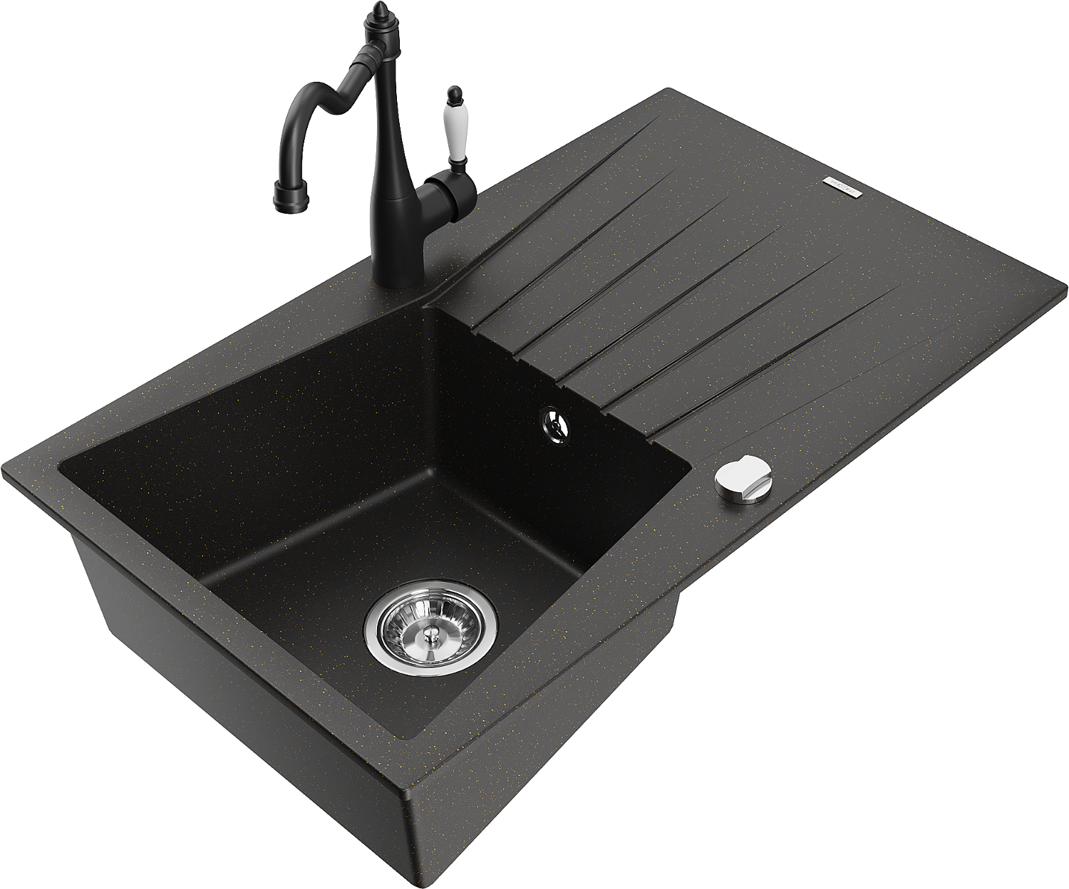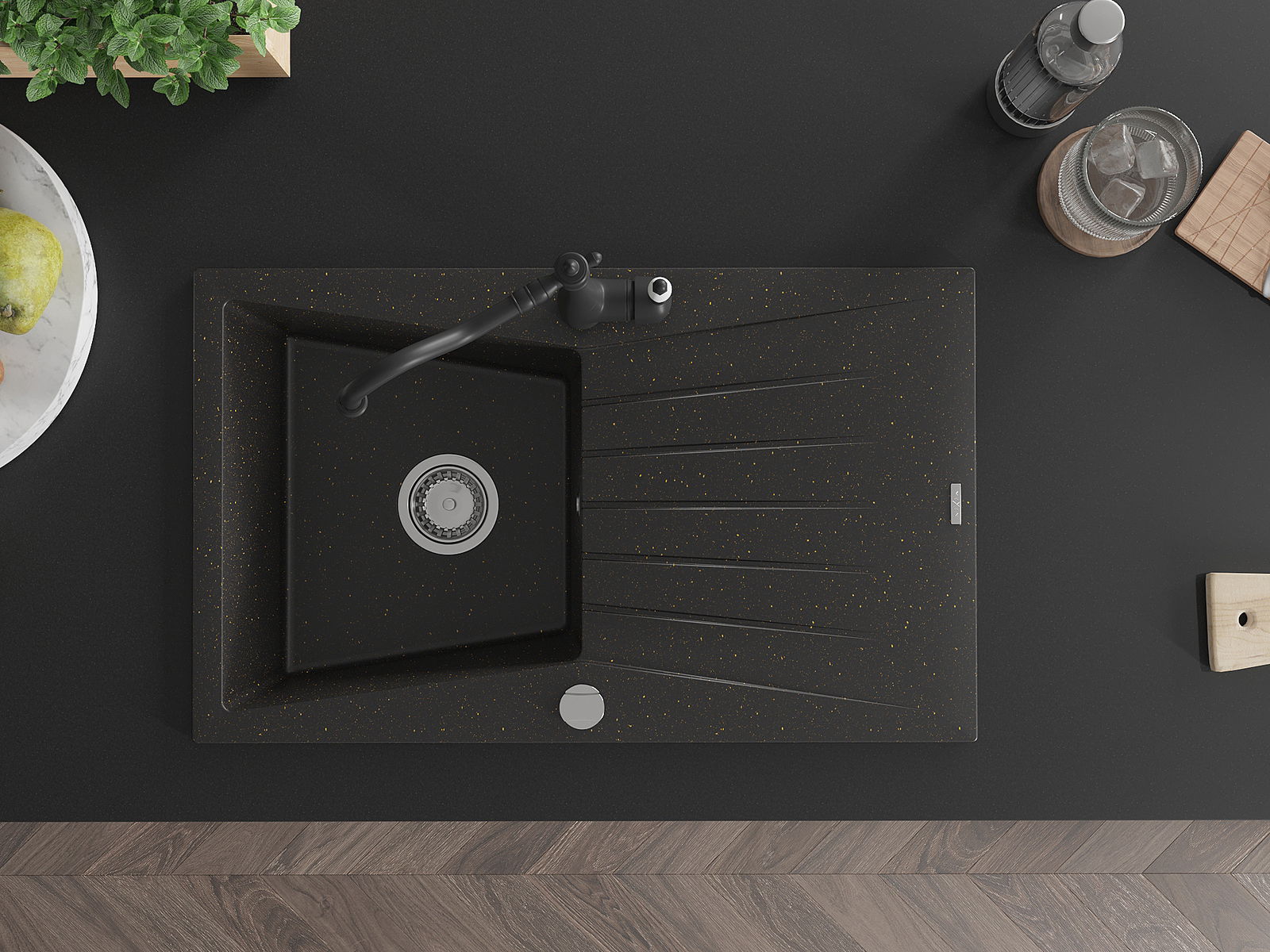 Mexen Cesar granitový dřez 1-komorový s odkapávačem a kuchyňskou baterií Carla, černý/zlatý metalik - 6514-75-670700-70