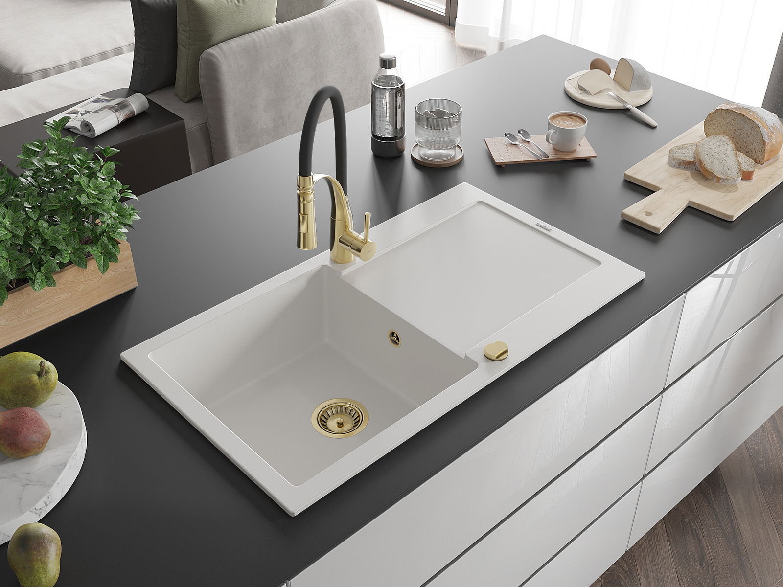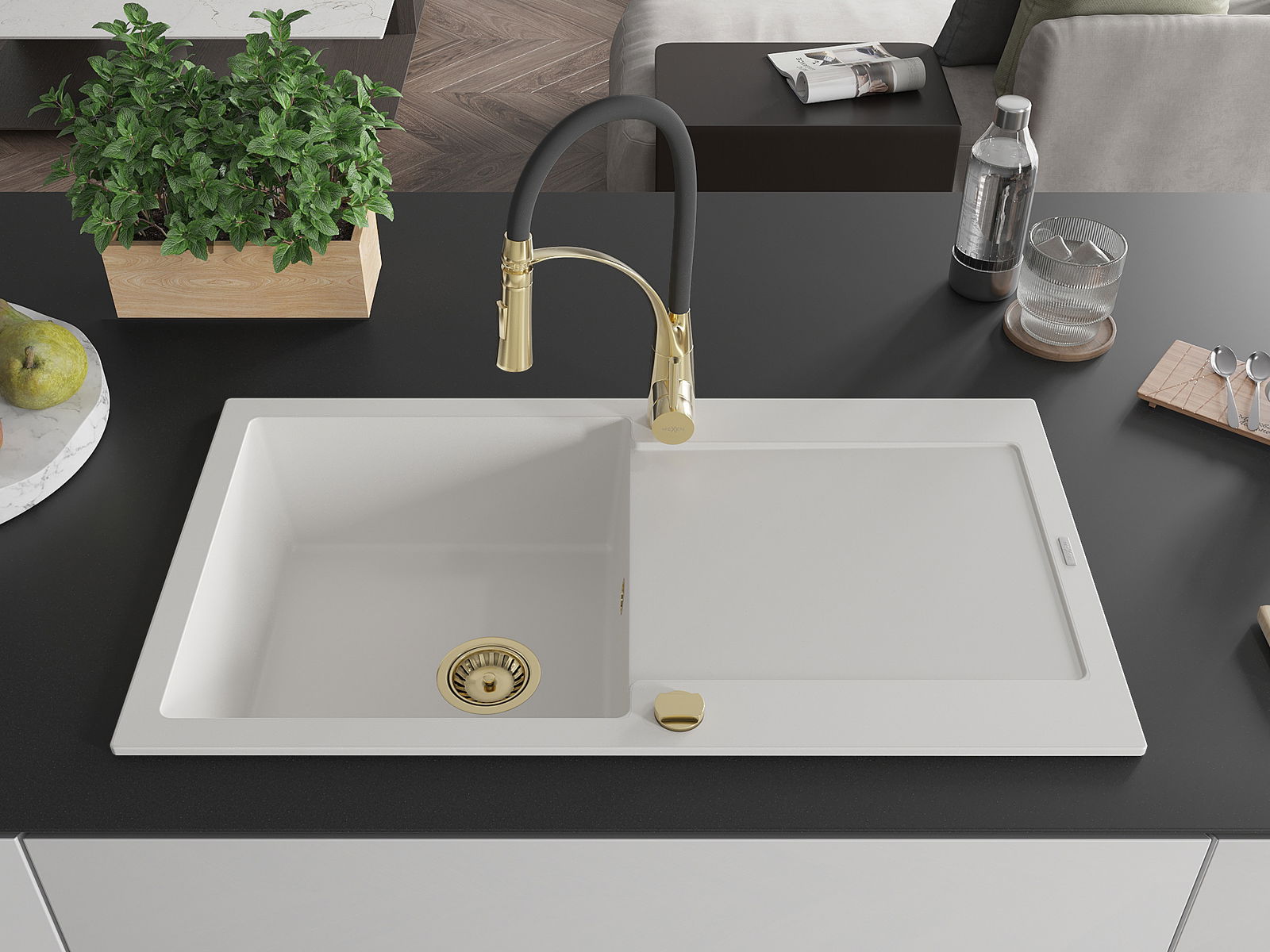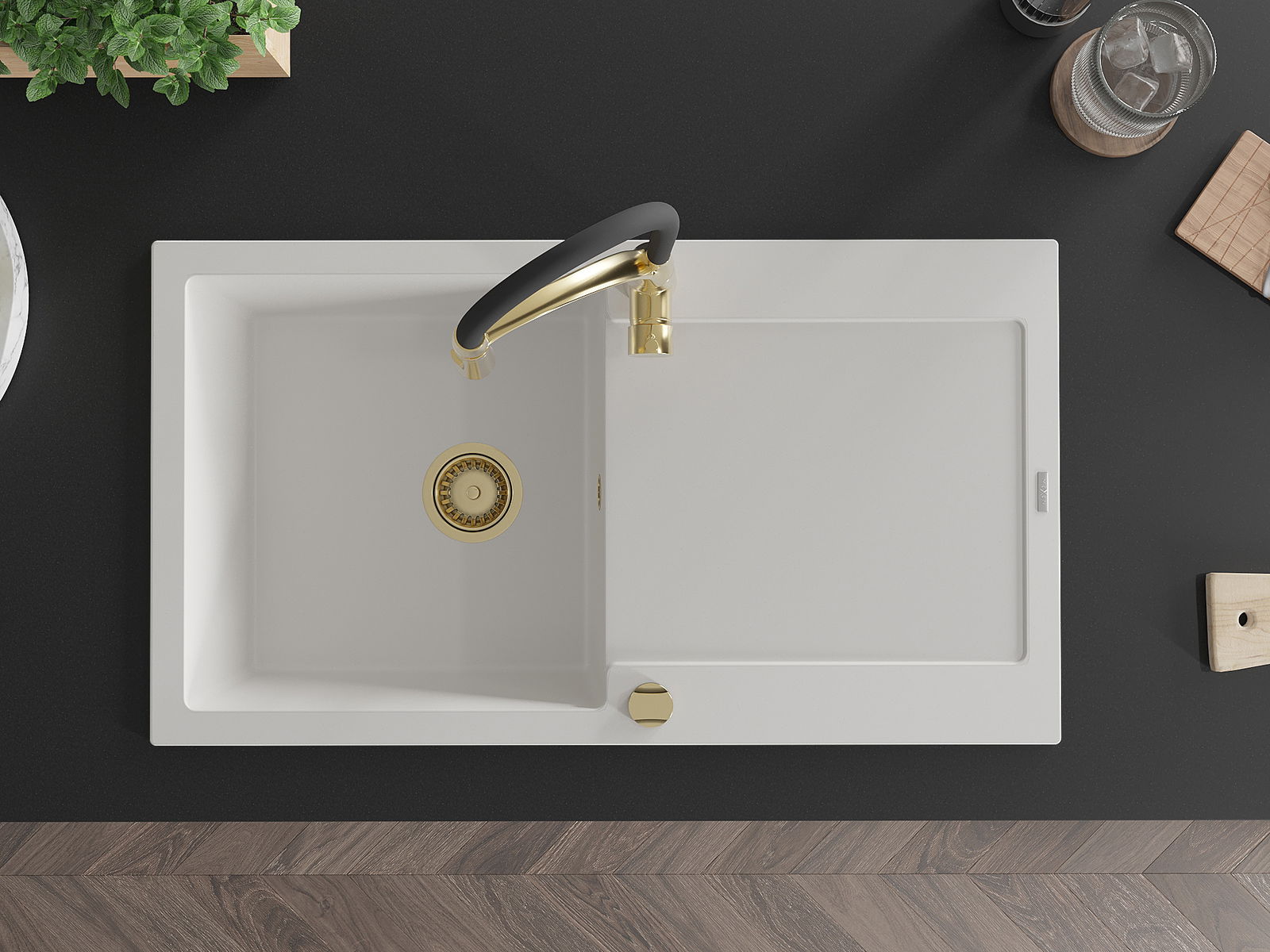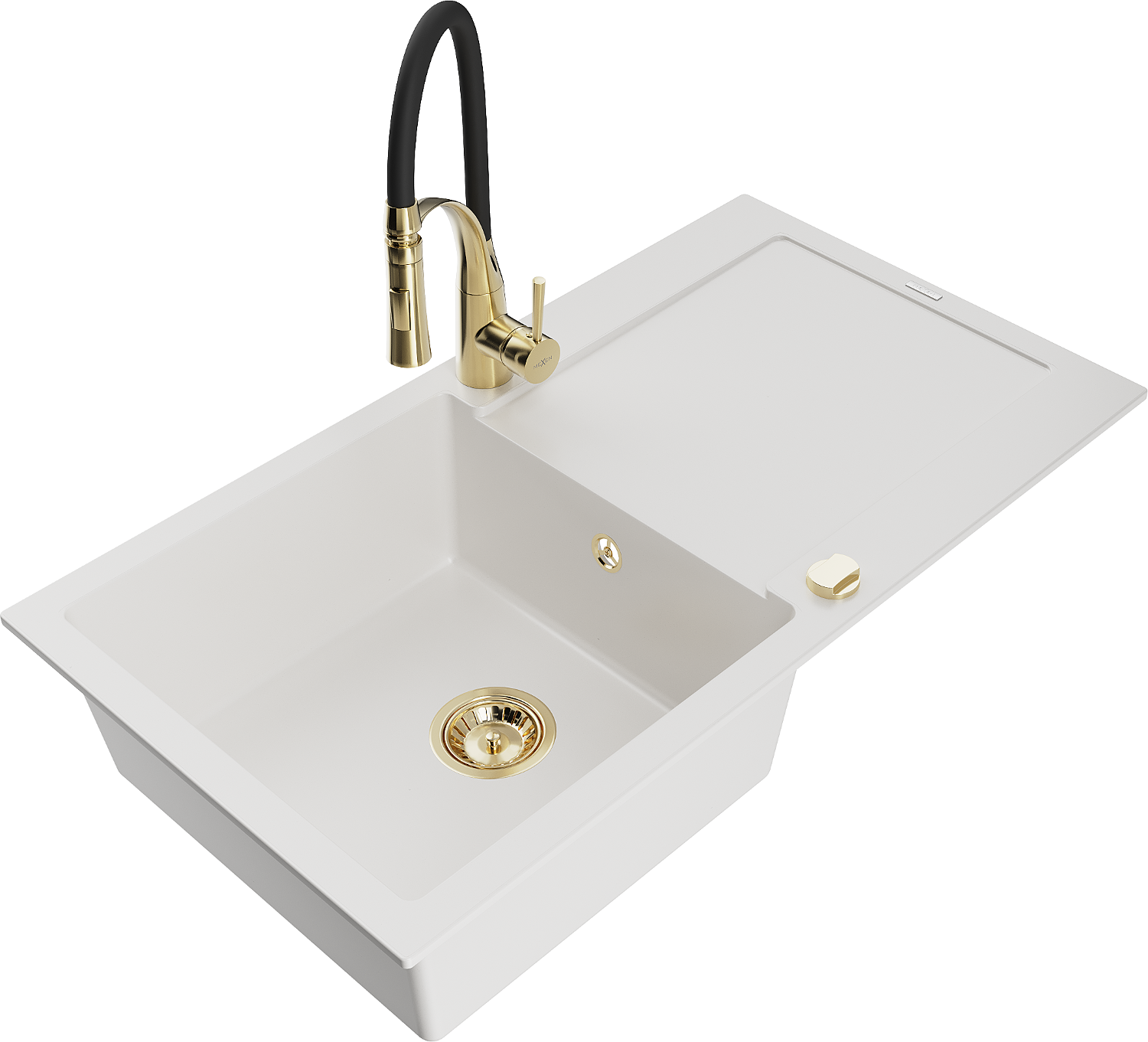 Mexen Leo granitový kuchyňský dřez 1-komorový s odkapávačem a kuchyňskou baterií Aster, bílý - 6501-20-73450-57-G