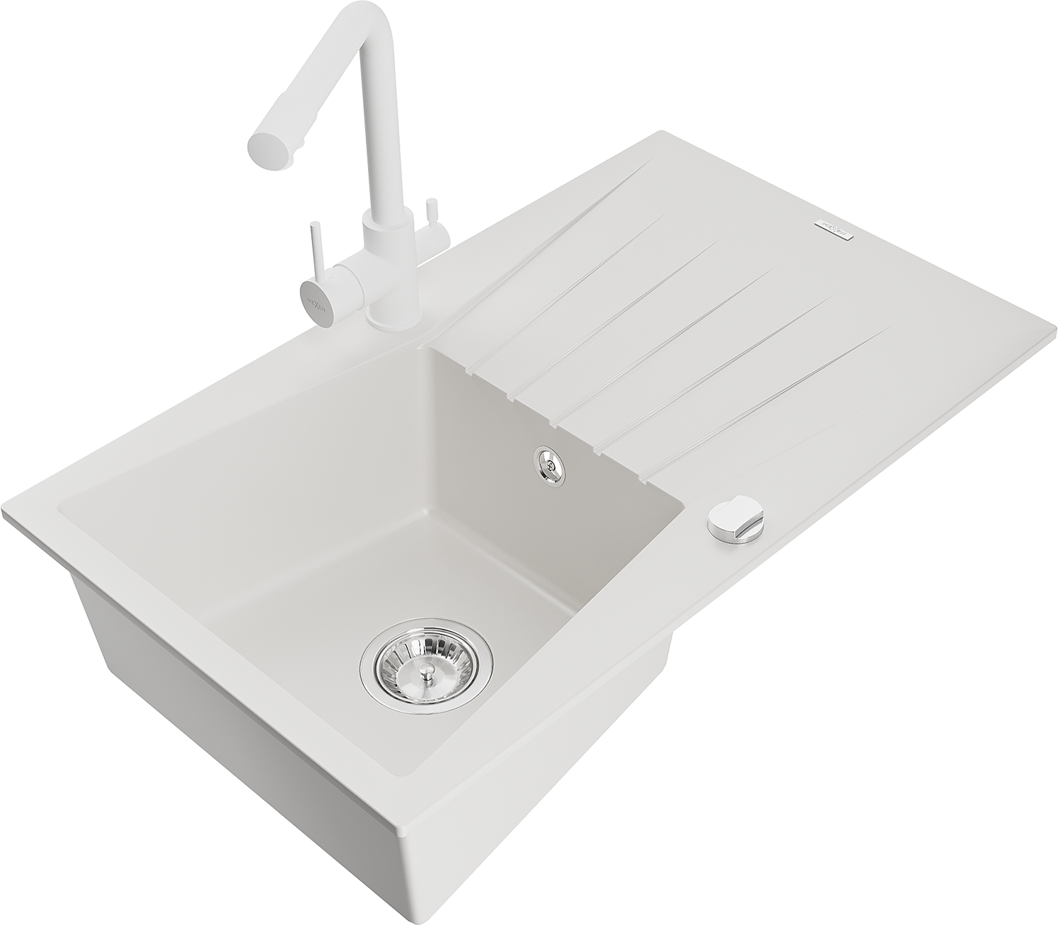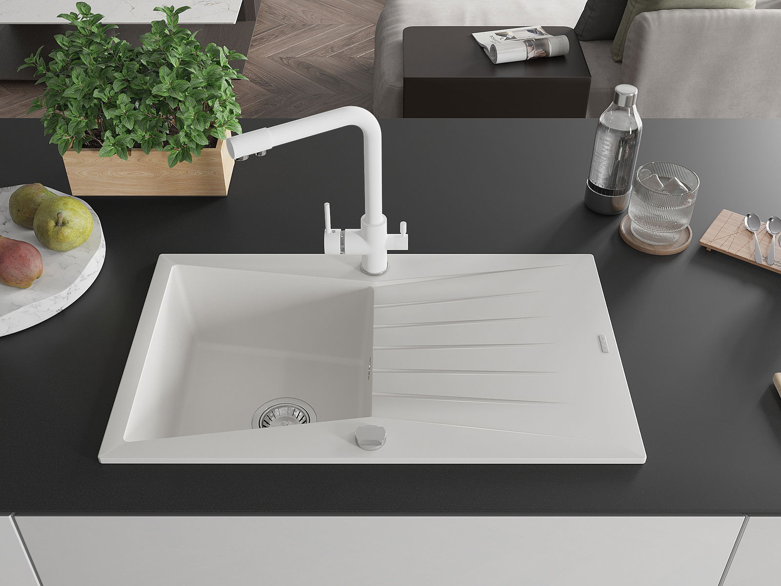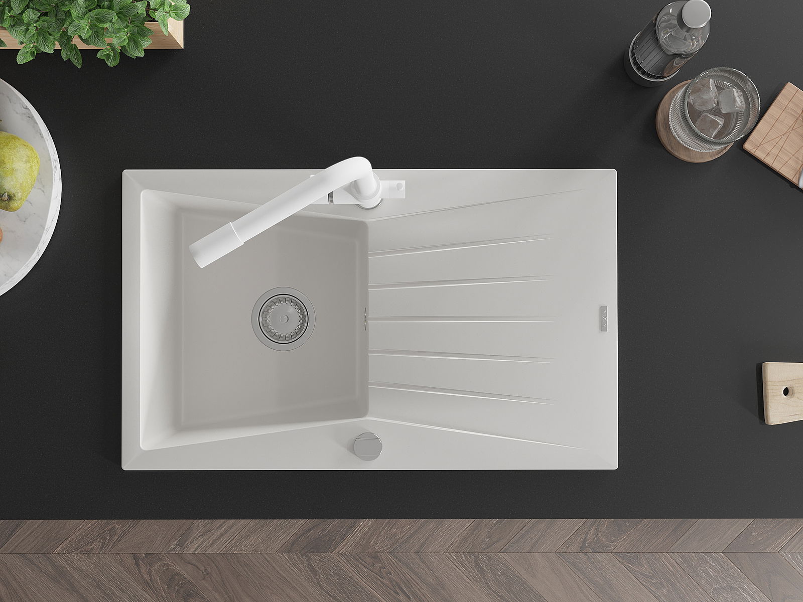 Mexen Cesar granitový dřez 1-komorový s odkapávačem a kuchyňskou baterií Duero, bílý - 6514-20-671600-20