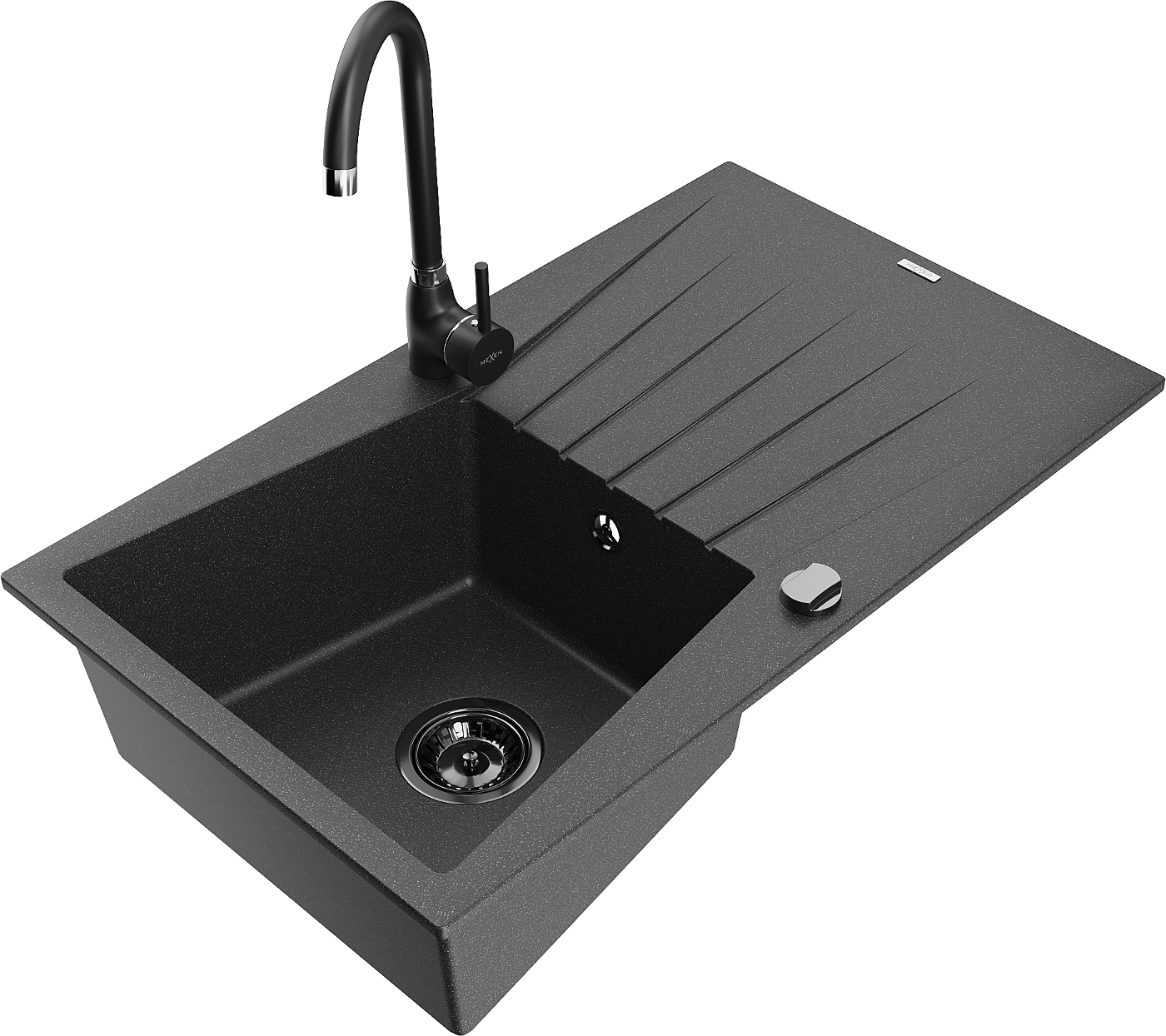 Mexen Cesar granitový dřez s jednou komorou, odkapávačem a kuchyňskou baterií Telma, černý kropenatý