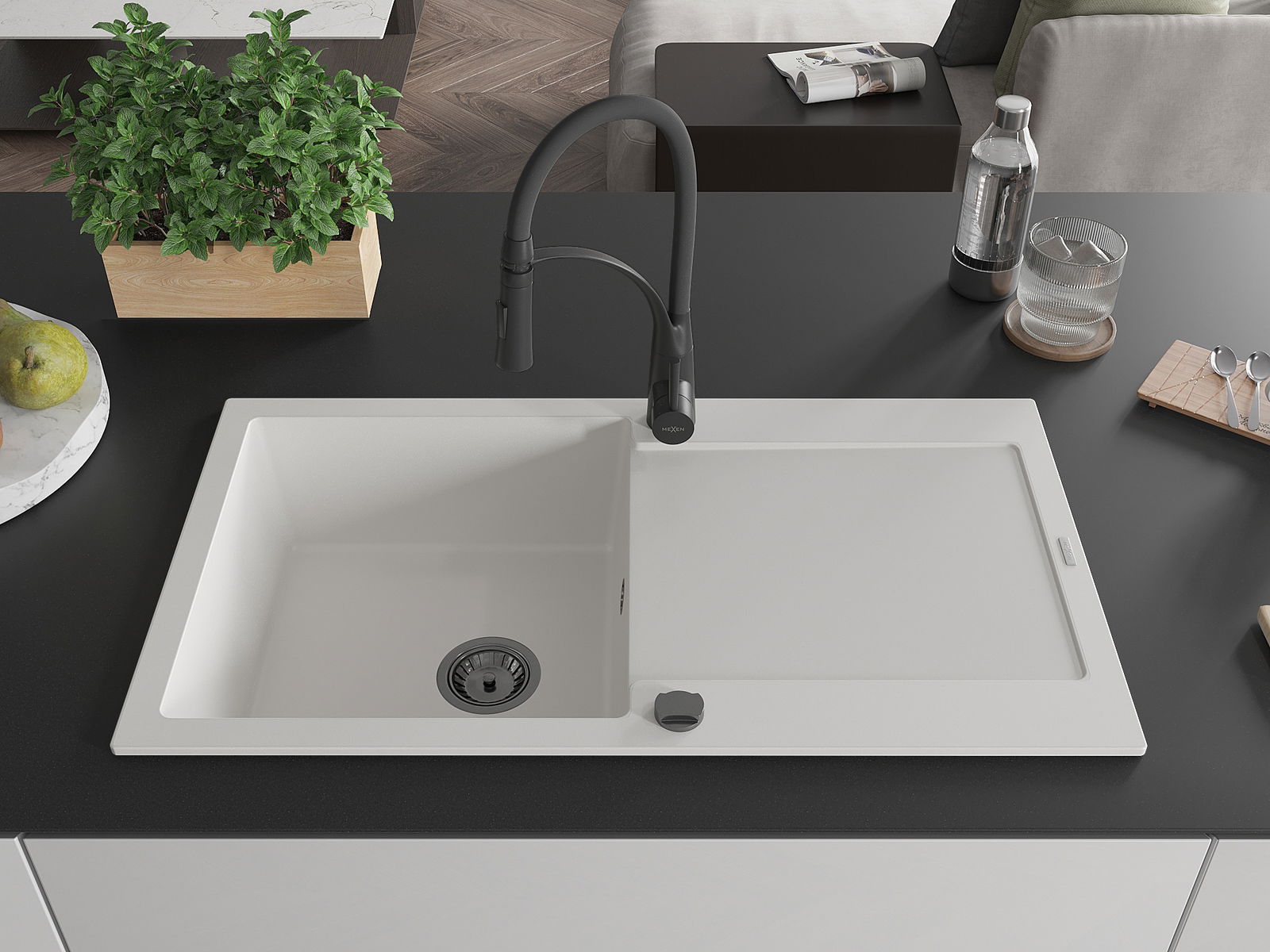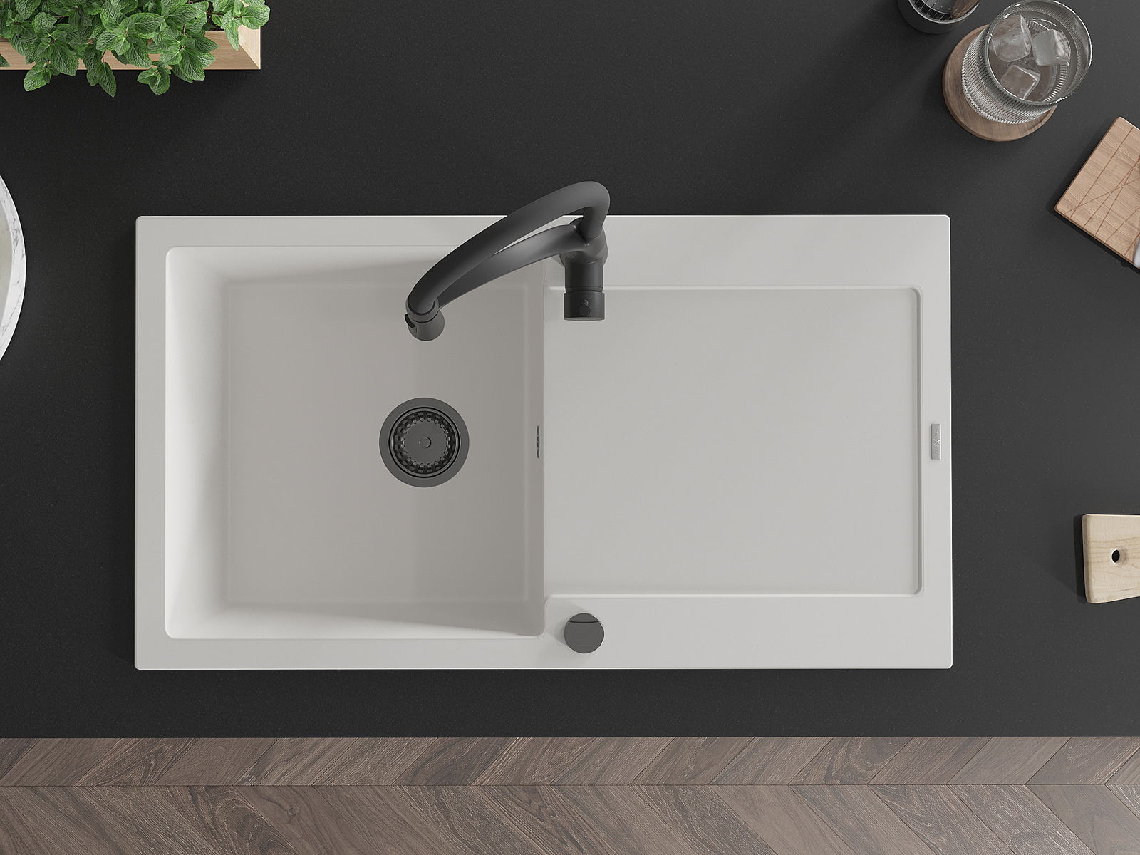 Mexen Leo dřez granitový 1-komorový s odkapávačem a kuchyňskou baterií Aster, bílý - 6501-20-73450-70-B