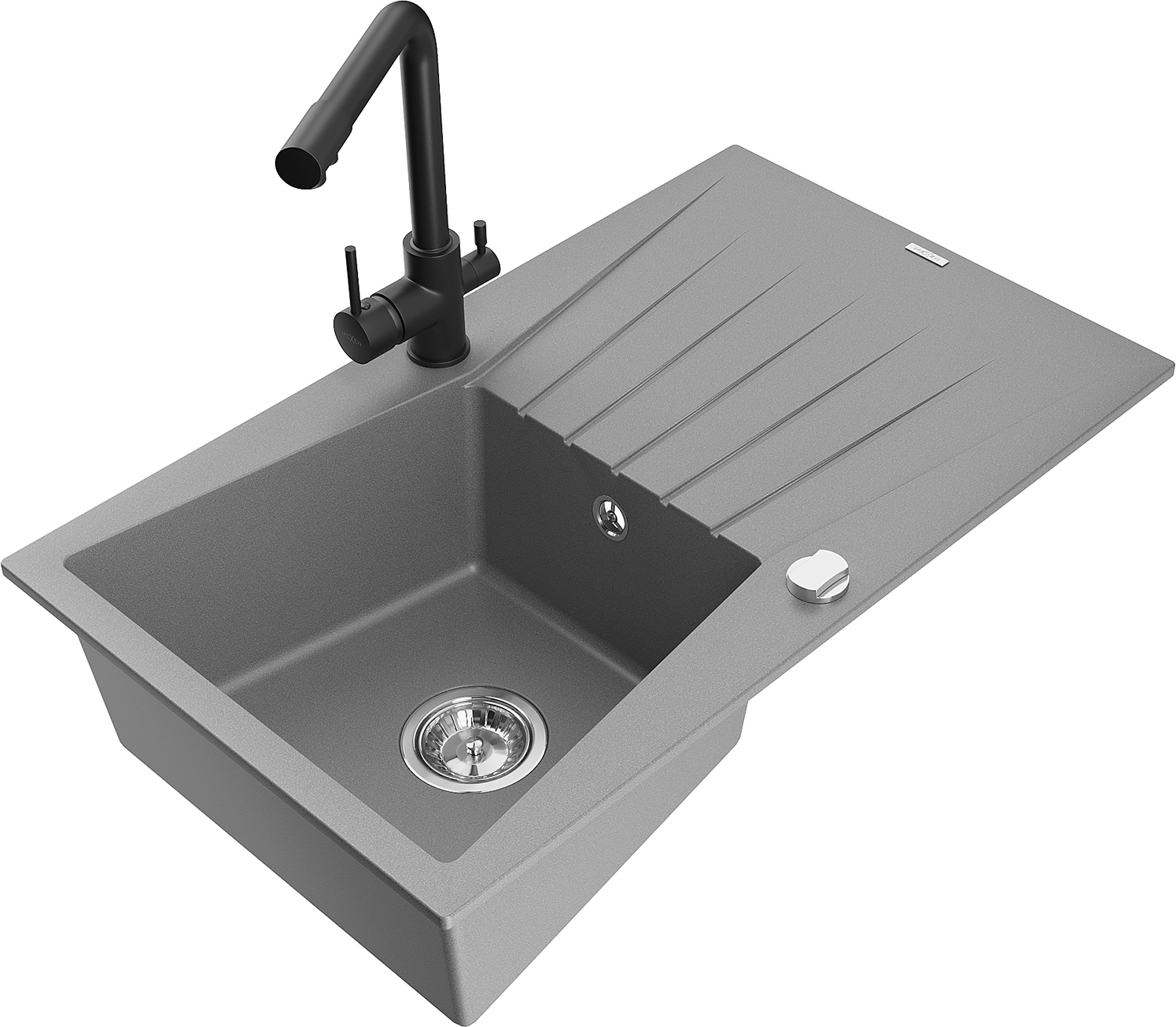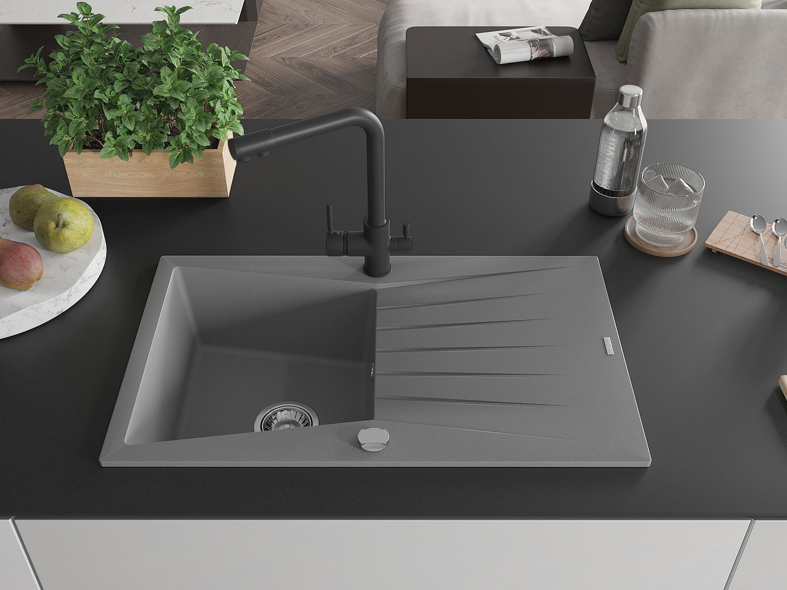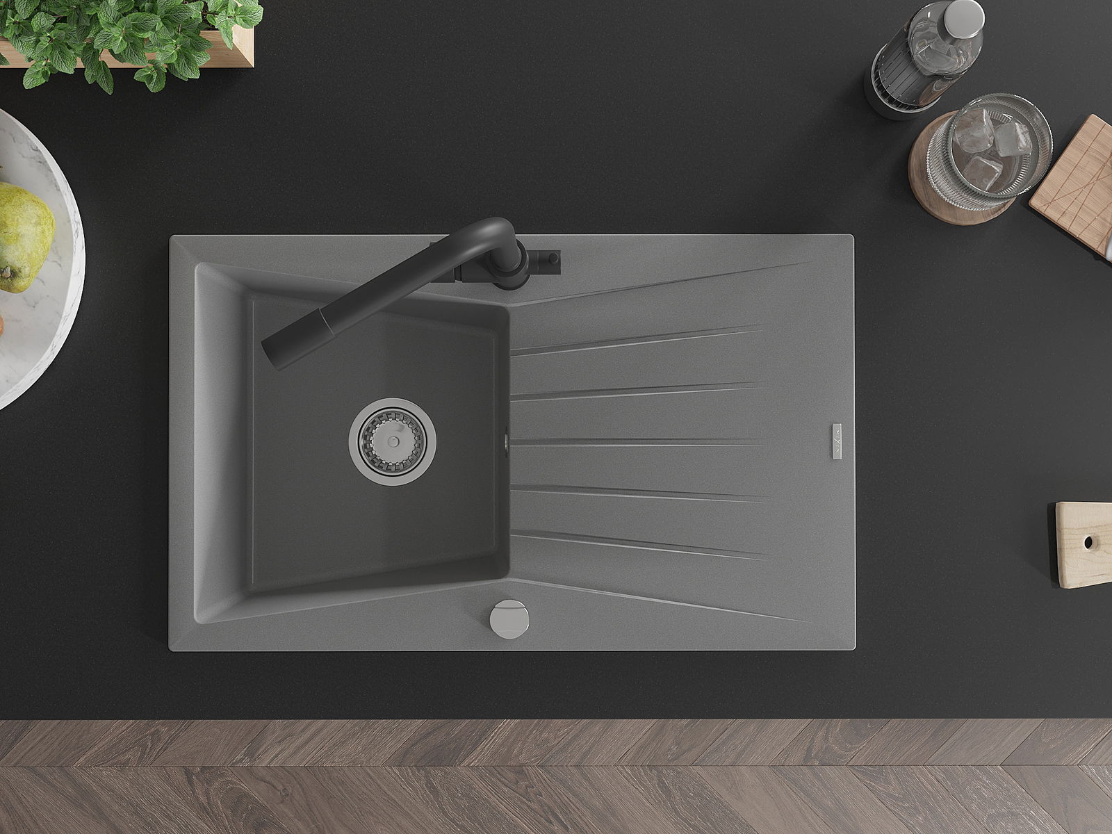Mexen Cesar granitový dřez 1-komorový s odkapávačem a kuchyňskou baterií Duero, šedý - 6514-71-671600-70