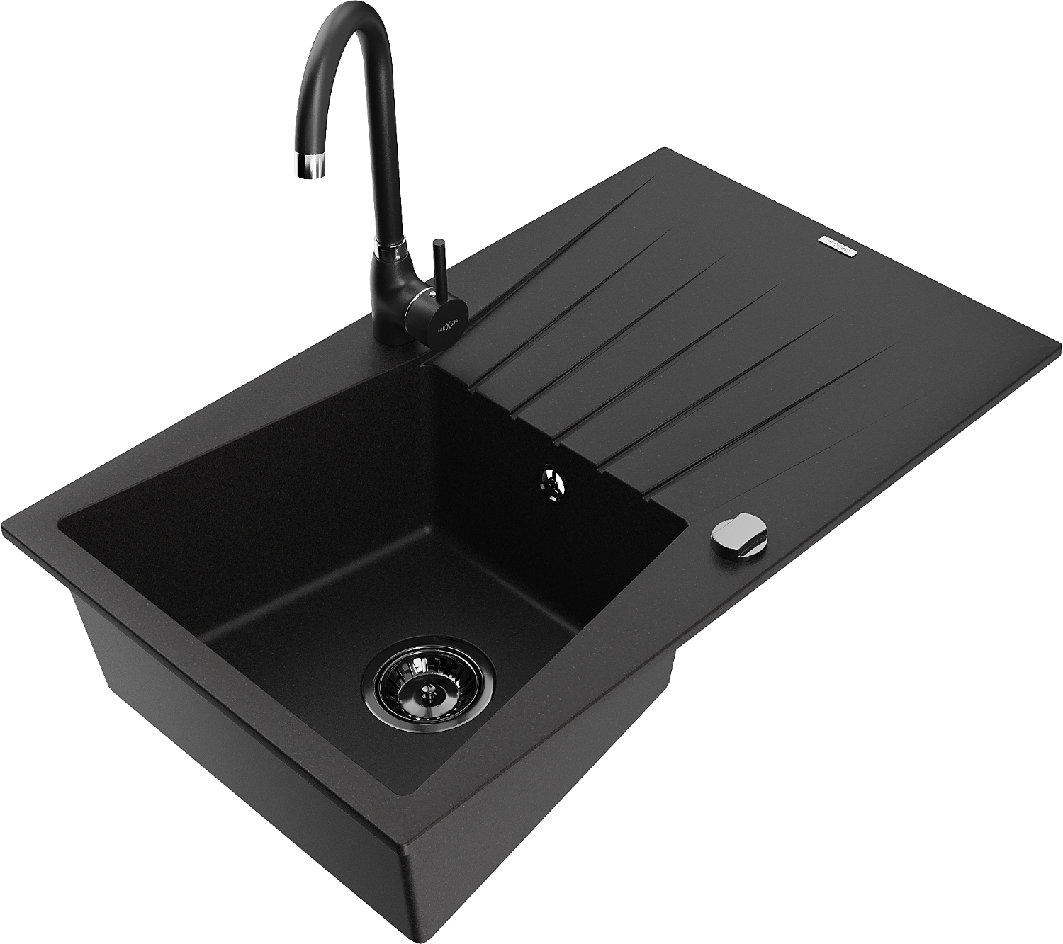 Mexen Cesar granitový dřez 1-komorový s odkapávačem a kuchyňskou baterií Telma, černý - 6514-77-670200-70-B
