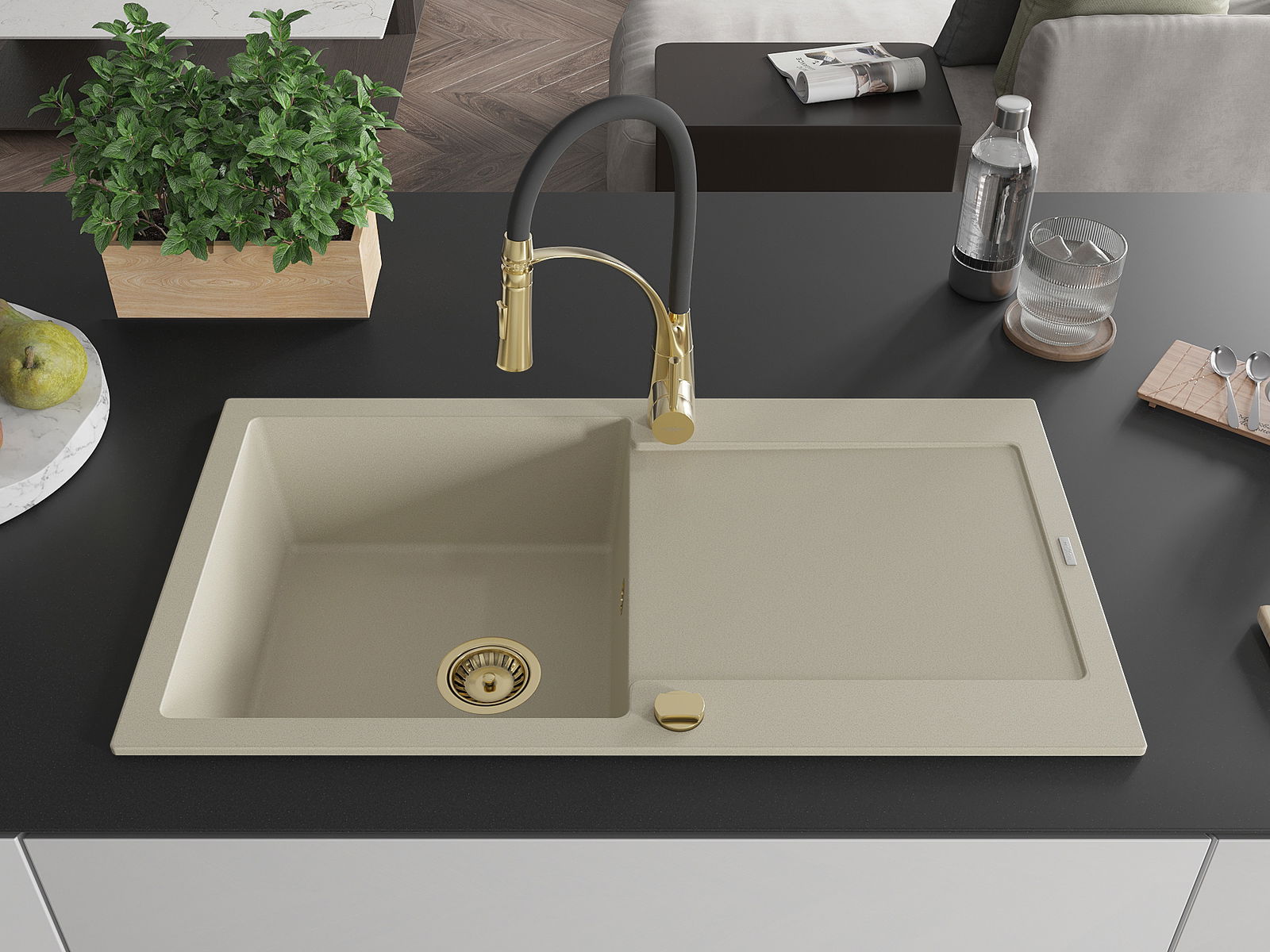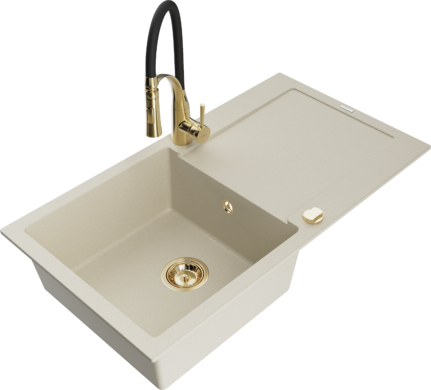 Mexen Leo granitový dřez s 1 komorou s odkapávačem a kuchyňskou baterií Aster, béžový - 6501-69-73450-57-G