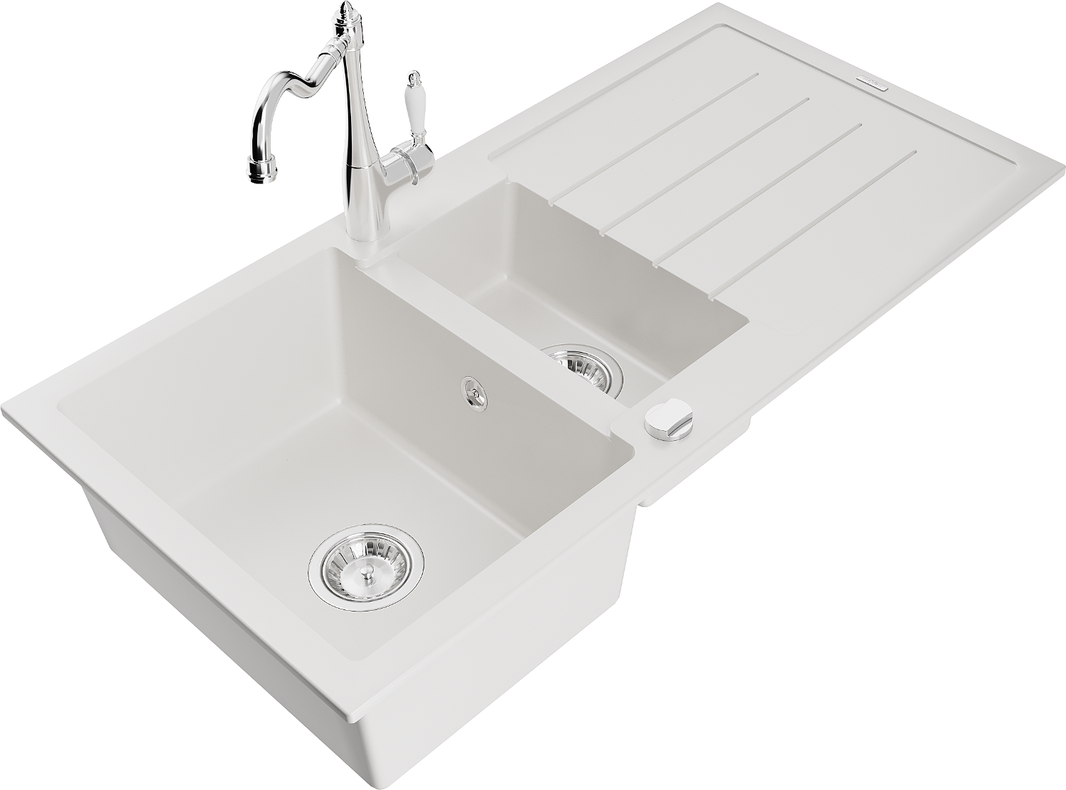 Mexen Andres granitový dřez 1,5-komorový s odkapávačem a kuchyňskou baterií Carla, bílý - 6515-20-670700-00