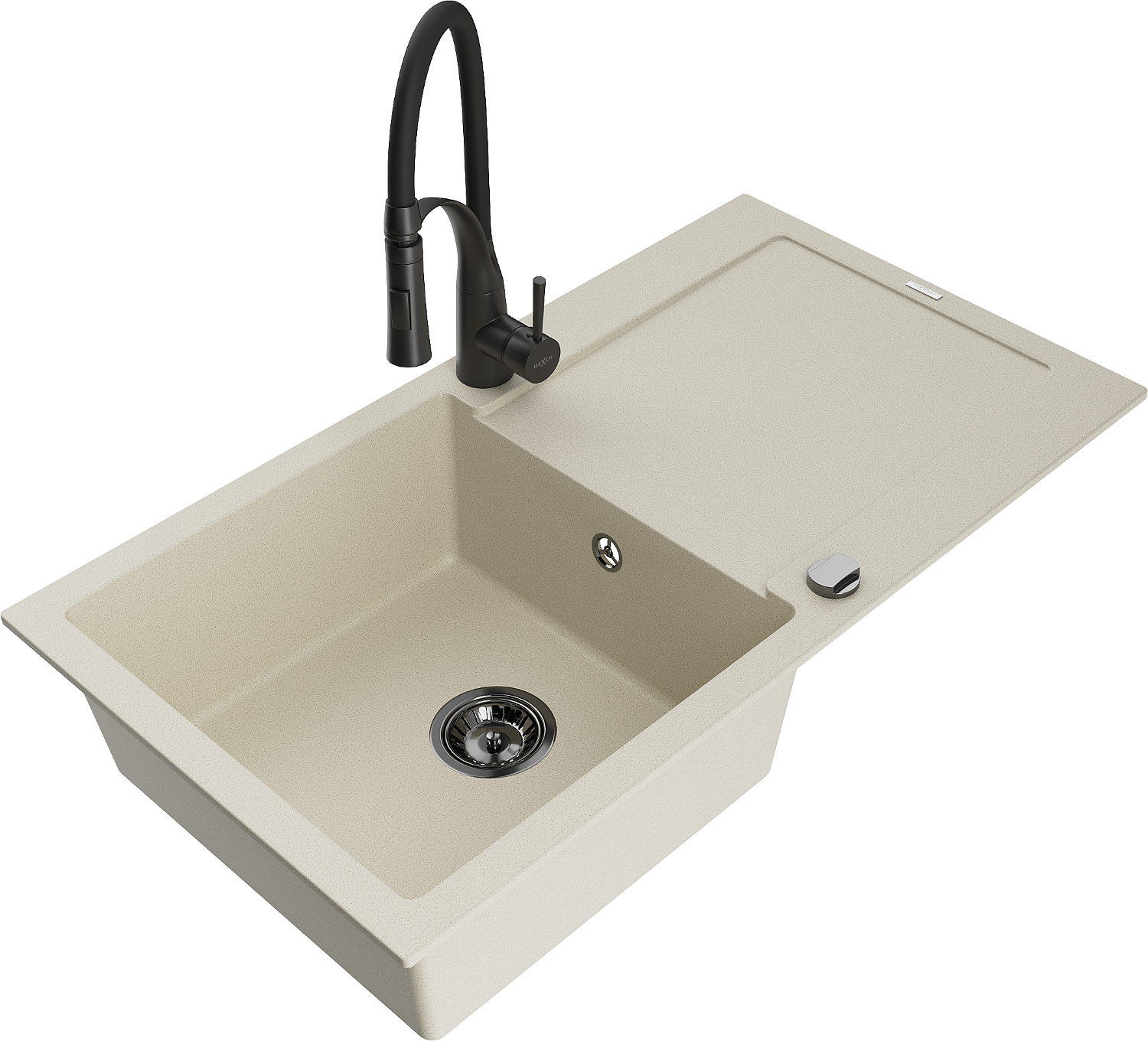 Mexen Leo granitový dřez s 1 komorou, odkapávačem a kuchyňskou baterií Aster, béžový - 6501-69-73450-70-B