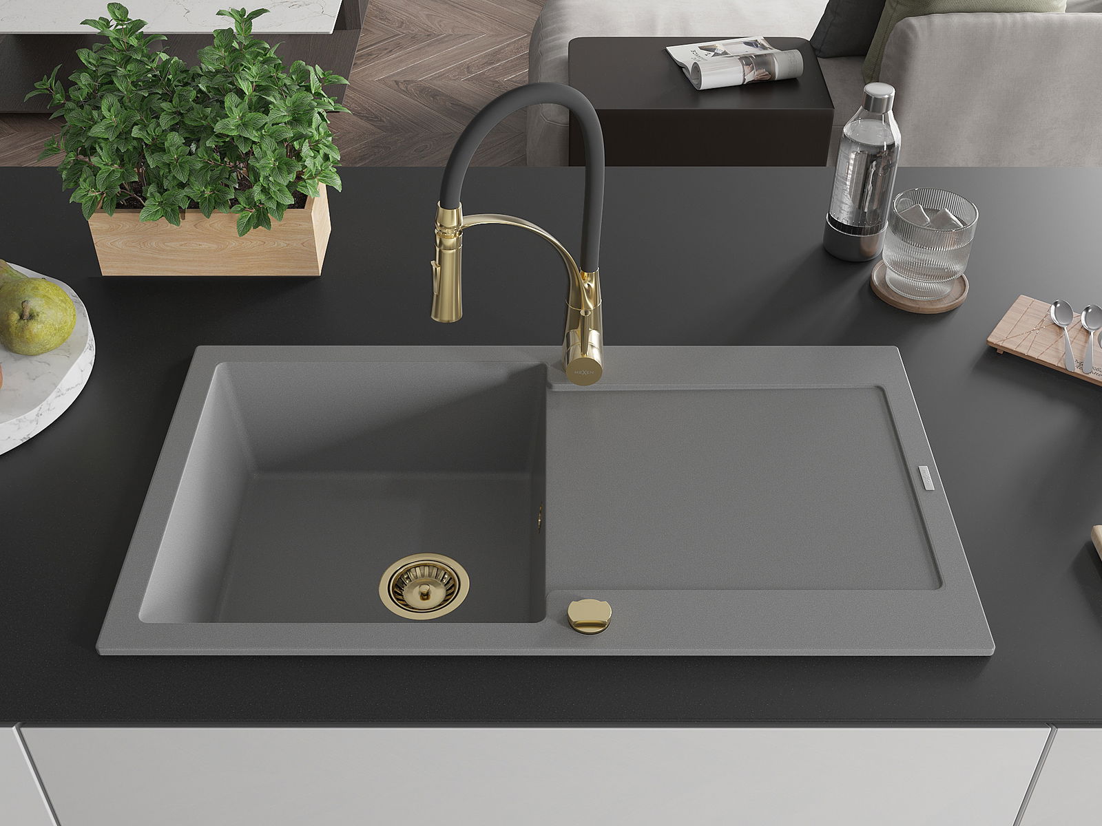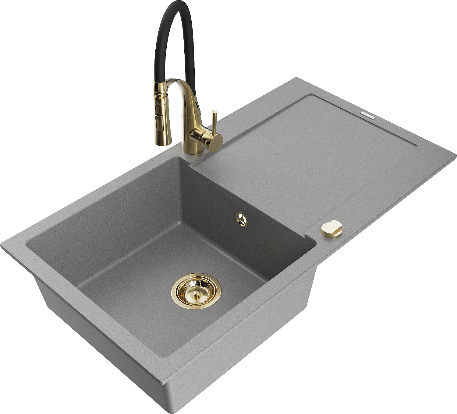 Mexen Leo granitový dřez 1-komorový s odkapávačem a kuchyňskou baterií Aster, šedý - 6501-71-73450-57-G