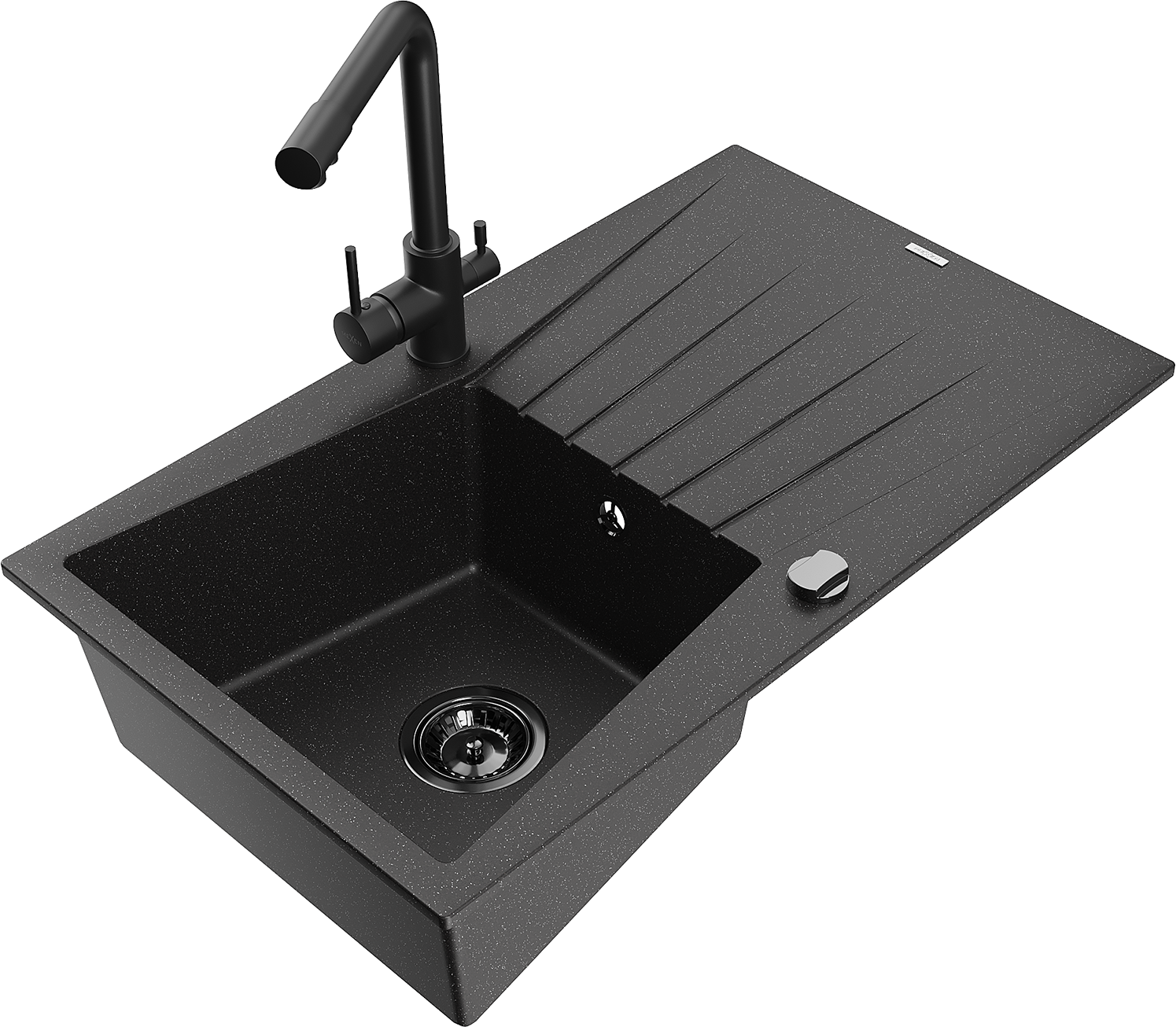 Mexen Cesar granitový dřez 1-komorový s odkapávačem a kuchyňskou baterií Duero, černý/stříbrný metalický - 6514-73-671600-70-B