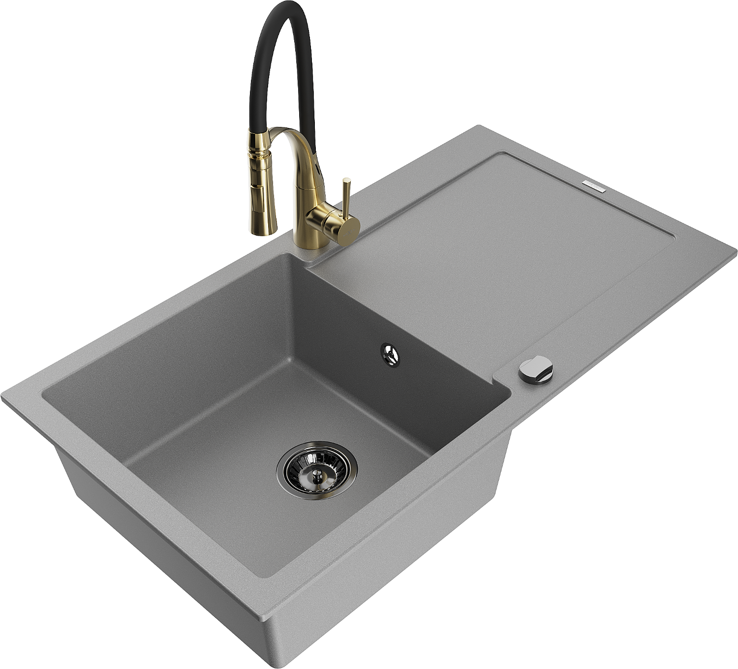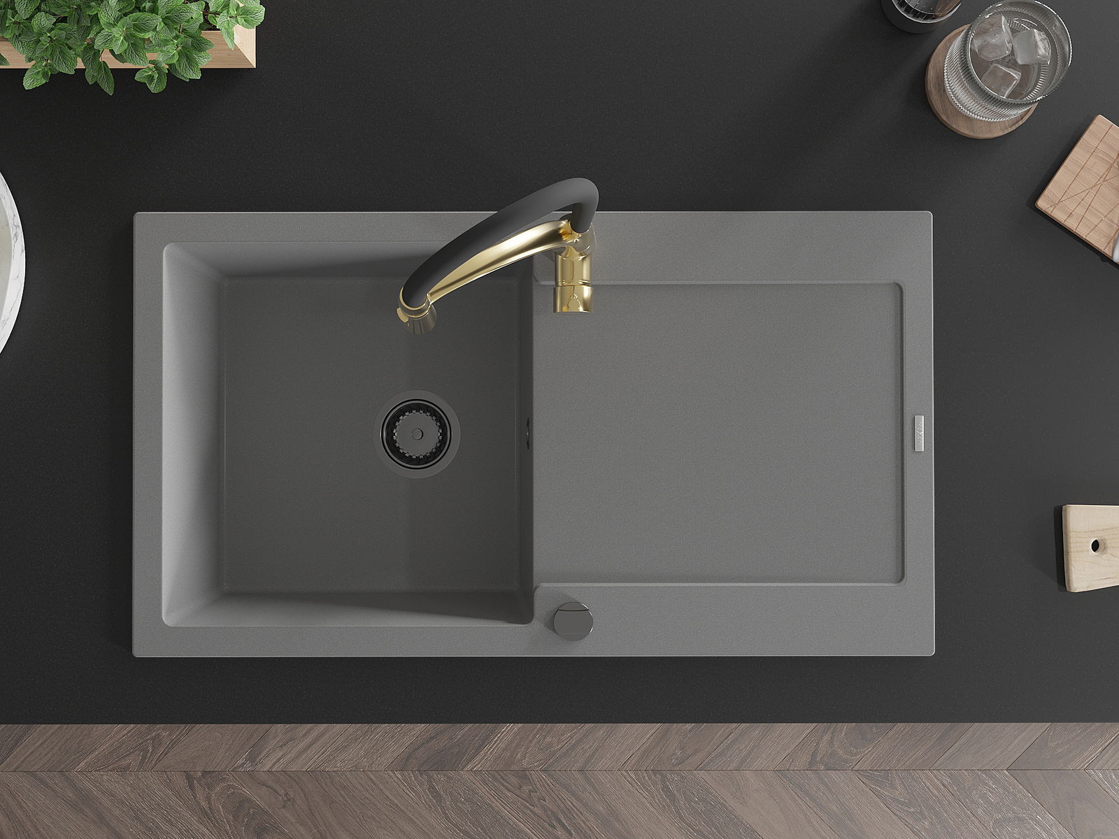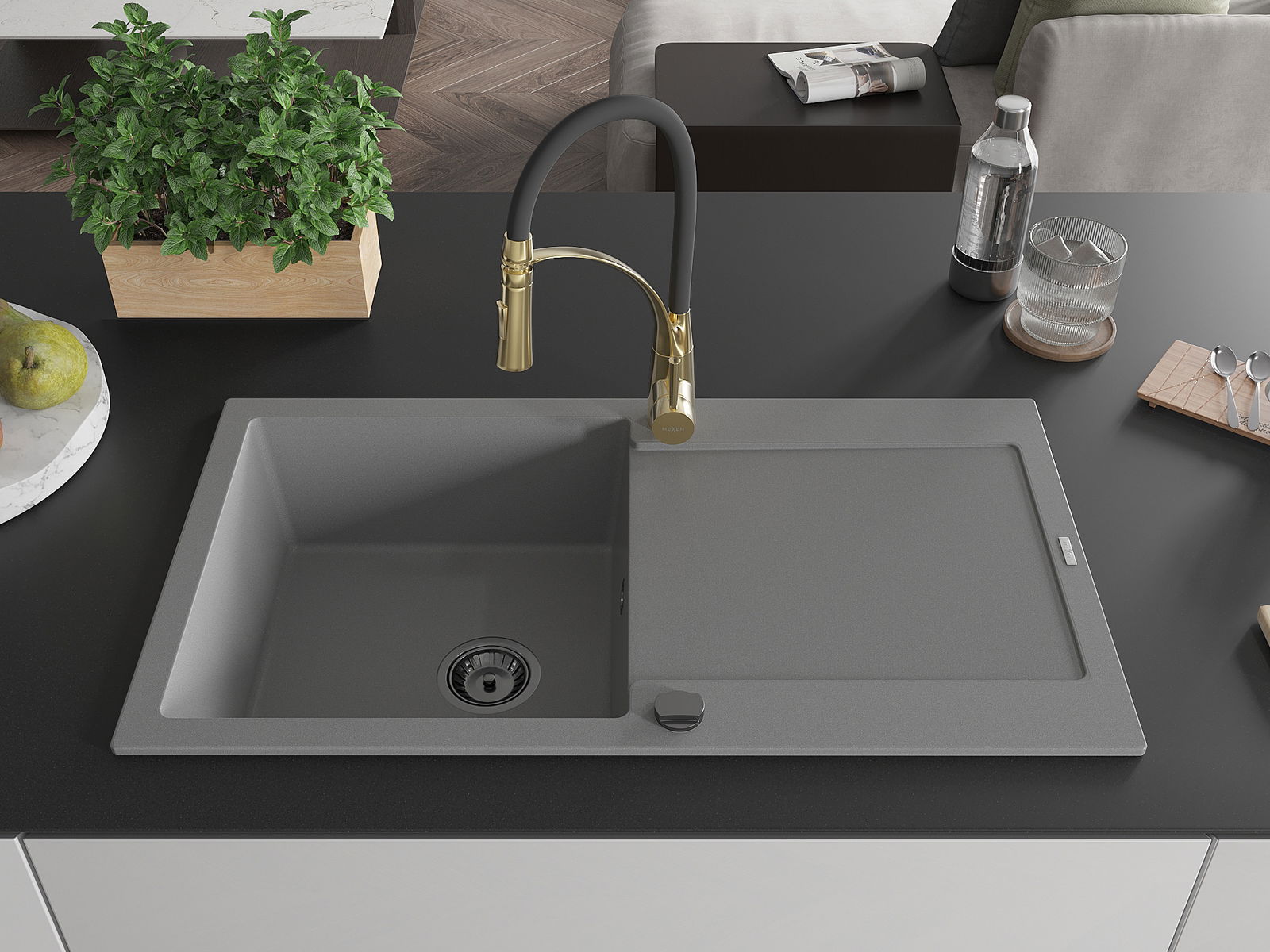 Mexen Leo granitový dřez s 1 komorou, odkapávačem a kuchyňskou baterií Aster, šedý - 6501-71-73450-57-B
