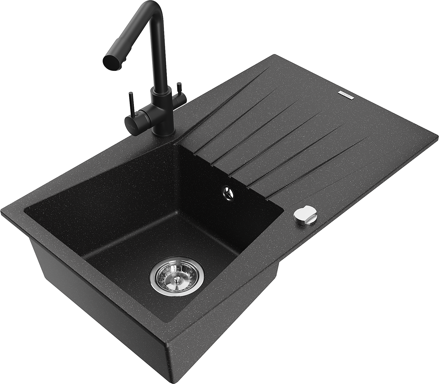 Mexen Cesar granitový dřez 1-komorový s odkapávačem a kuchyňskou baterií Duero, černý/stříbrný metalik - 6514-73-671600-70