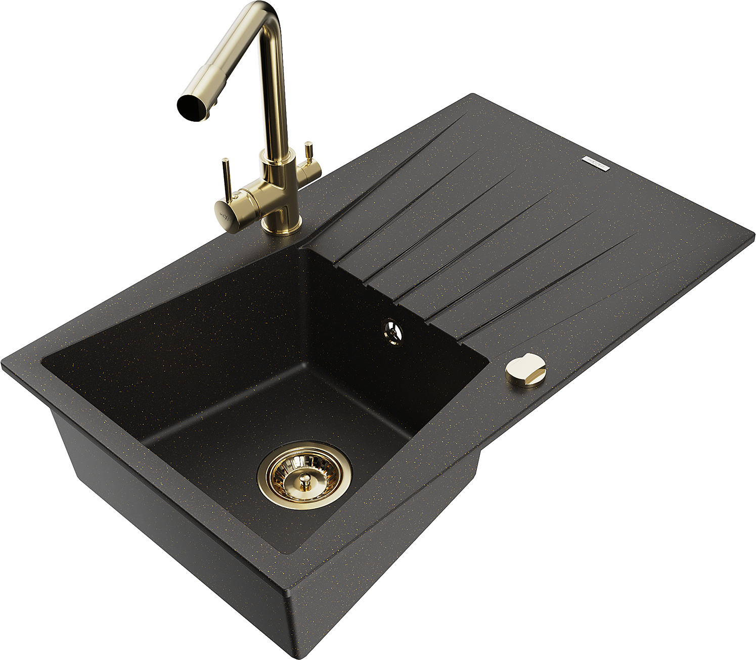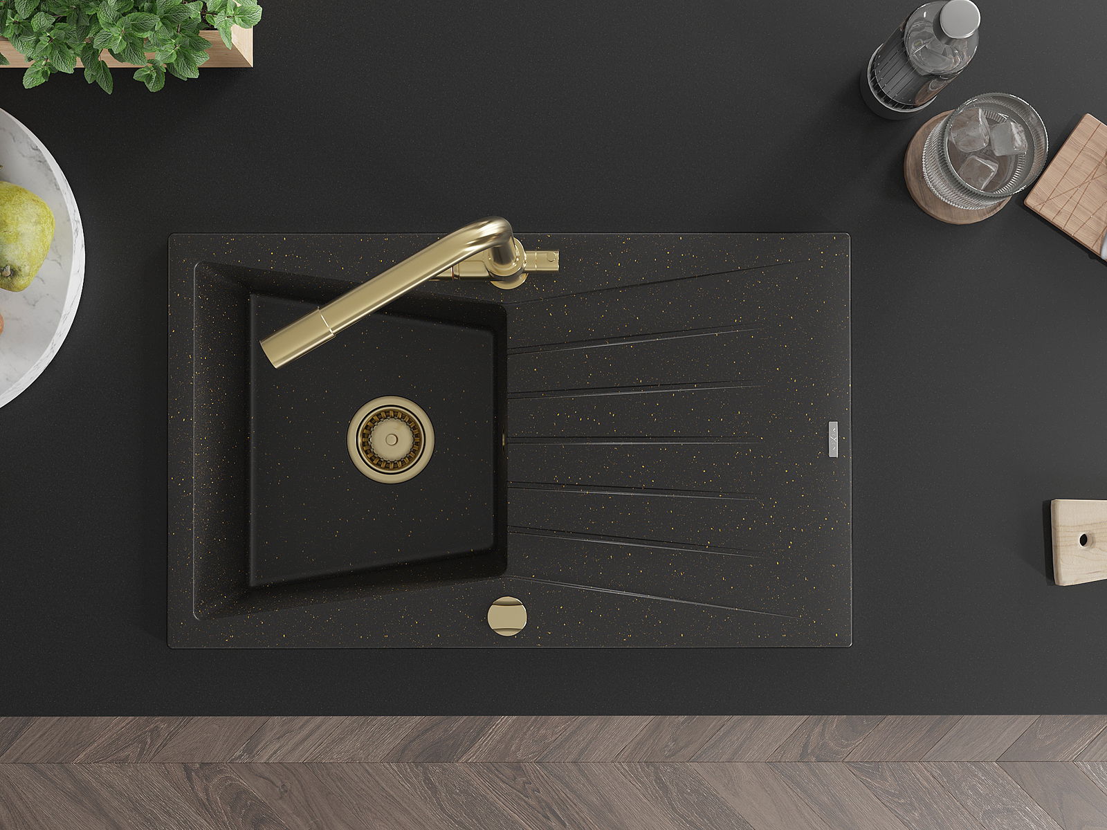 Mexen Cesar žulový dřez s 1 komorou, odkapávačem a kuchyňskou baterií Duero, černý/zlatý metalik - 6514-75-671600-50