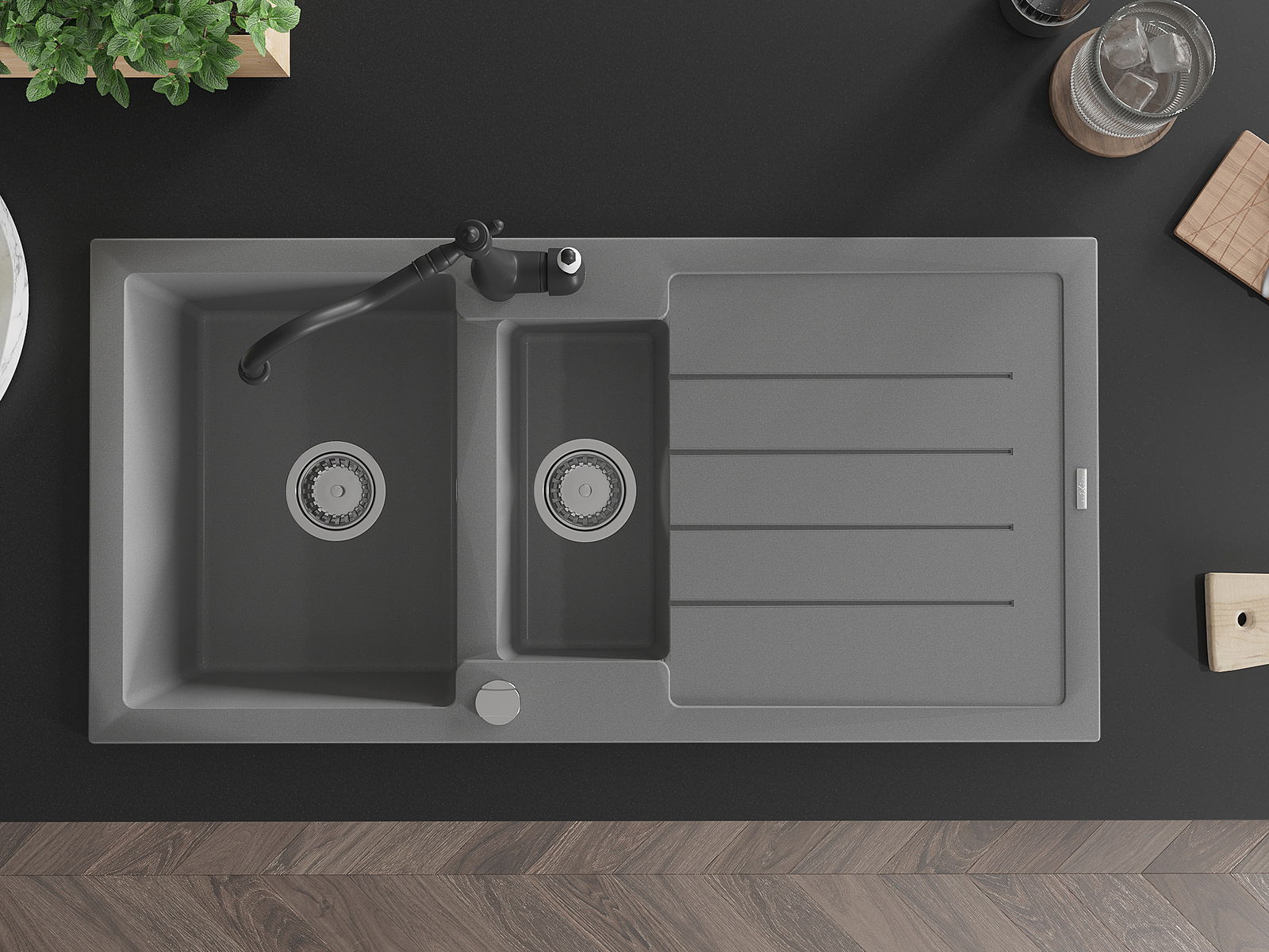 Mexen Andres granitový dřez 1,5komorový s odkapávačem a kuchyňskou baterií Carla, šedý - 6515-71-670700-70