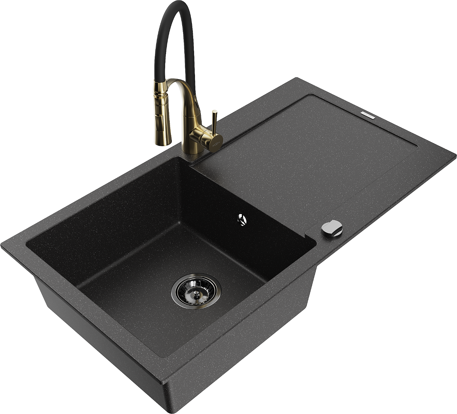 Mexen Leo granitový dřez 1-komorový s odkapávačem a kuchyňskou baterií Aster, černý/stříbrný metalík - 6501-73-73450-57-B