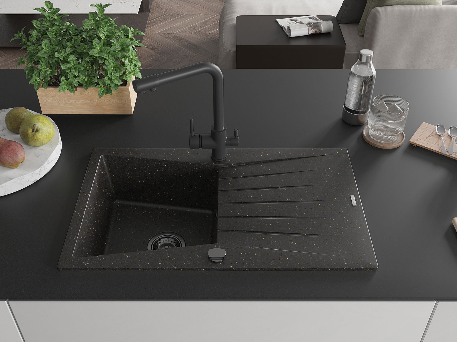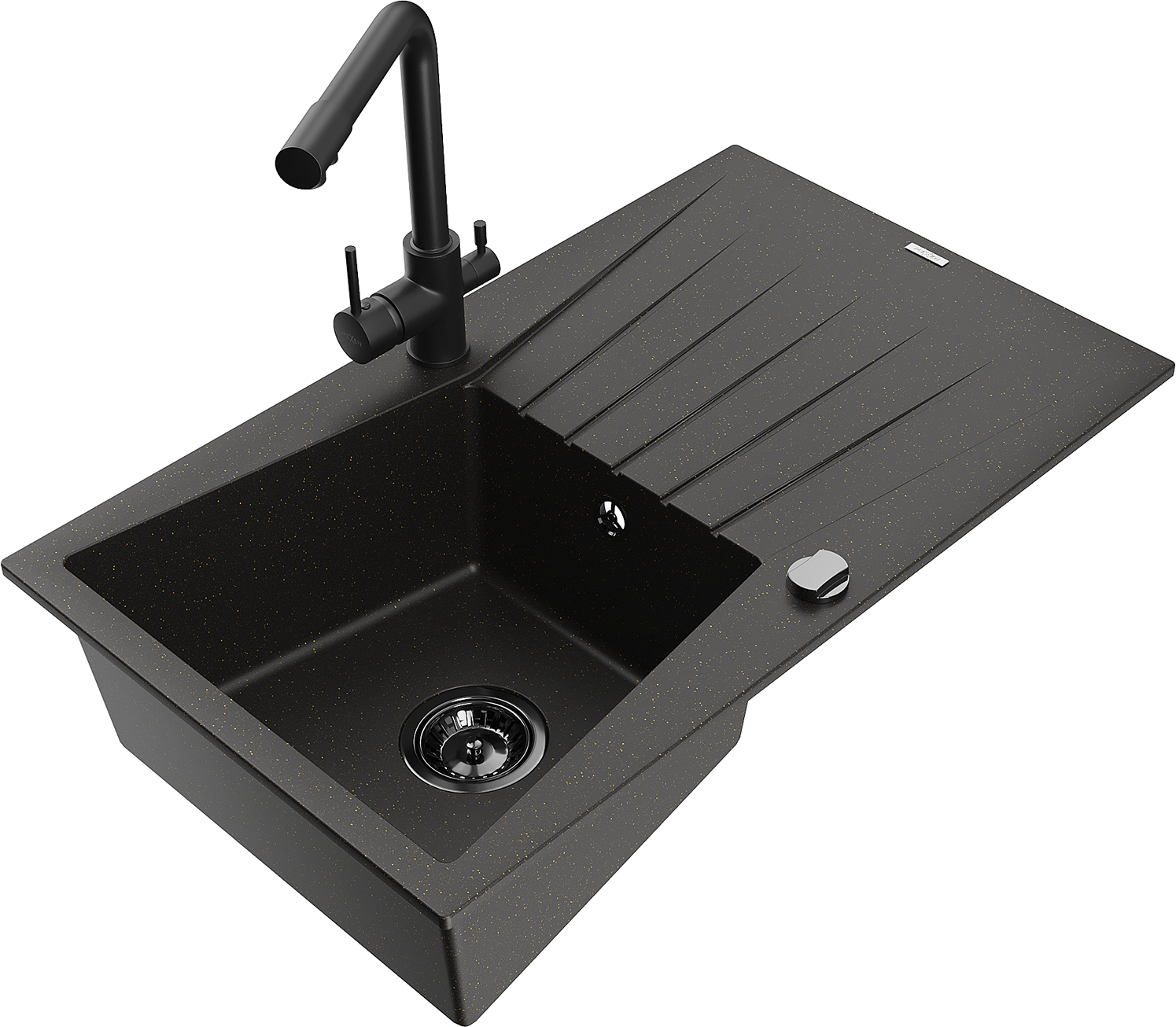 Mexen Cesar granitový dřez 1-komorový s odkapávačem a kuchyňskou baterií Duero, černý/zlatý metalický - 6514-75-671600-70-B
