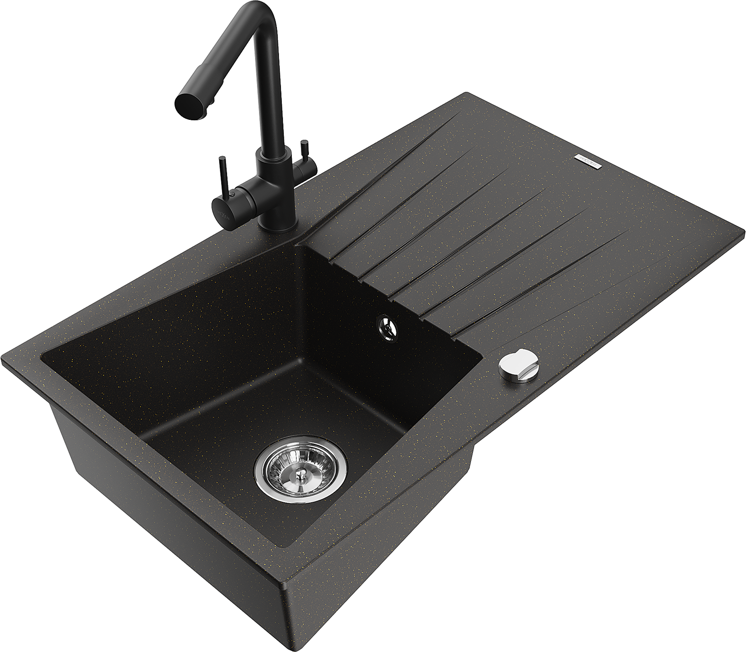 Mexen Cesar granitový dřez 1-komorový s odkapávačem a kuchyňskou baterií Duero, černý/zlatý metalický - 6514-75-671600-70