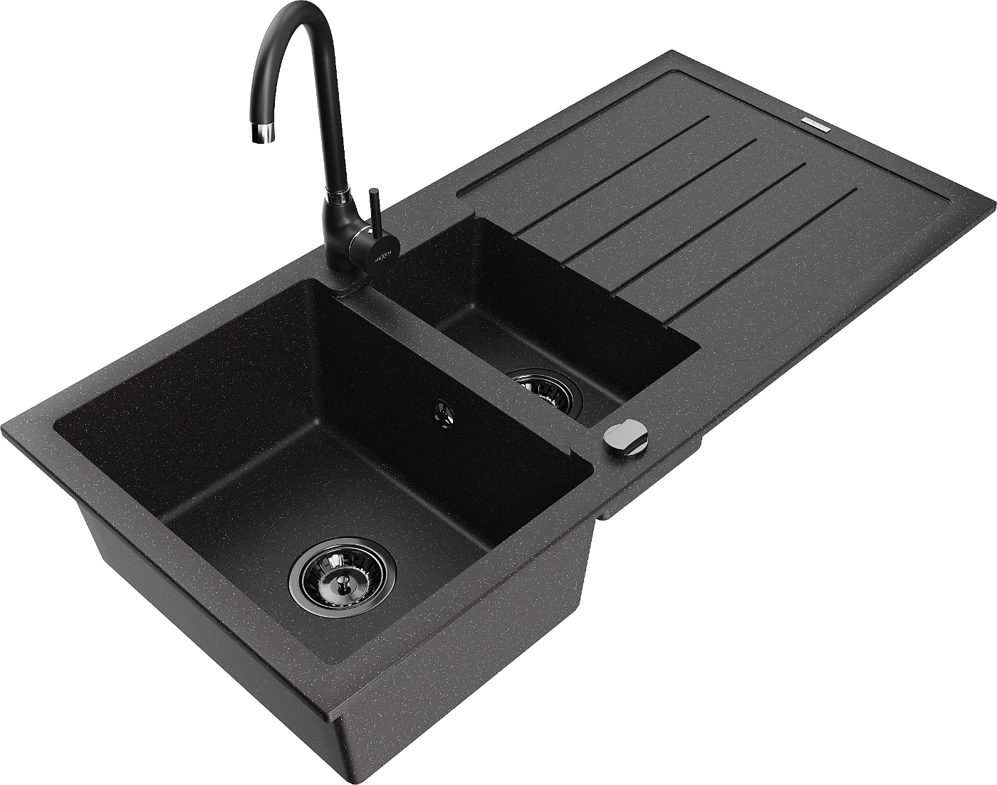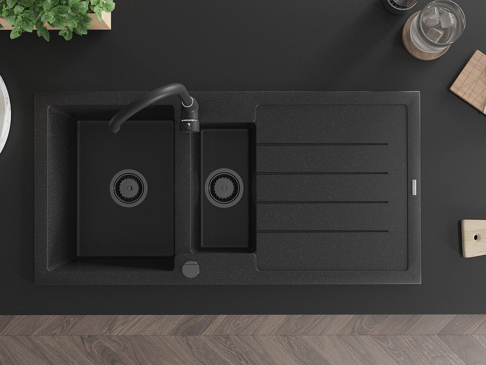 Mexen Andres granitový dřez 1,5-komorový s odkapávačem a kuchyňskou baterií Telma, černý/stříbrný - 6515-73-670200-70-B