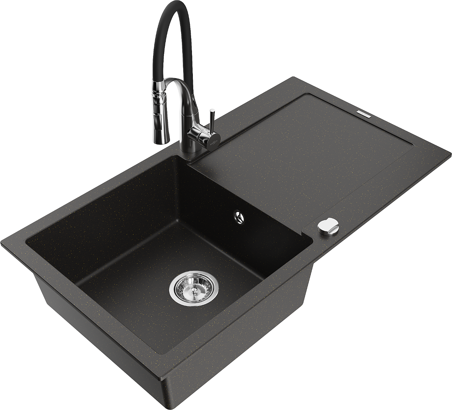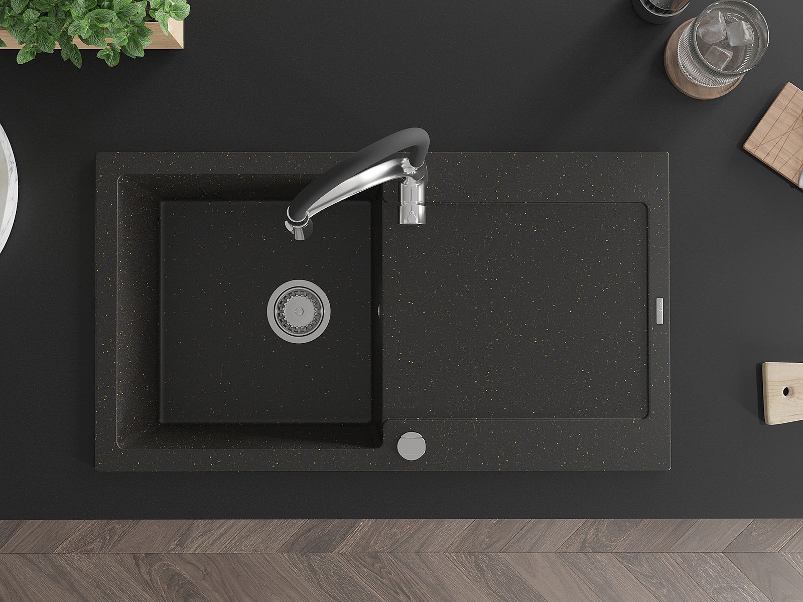 Mexen Leo granitový dřez 1-komorový s odkapávačem a kuchyňskou baterií Aster, černý/zlatý metalik - 6501-75-73450-07