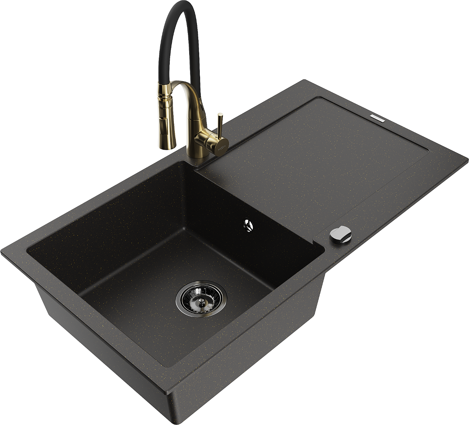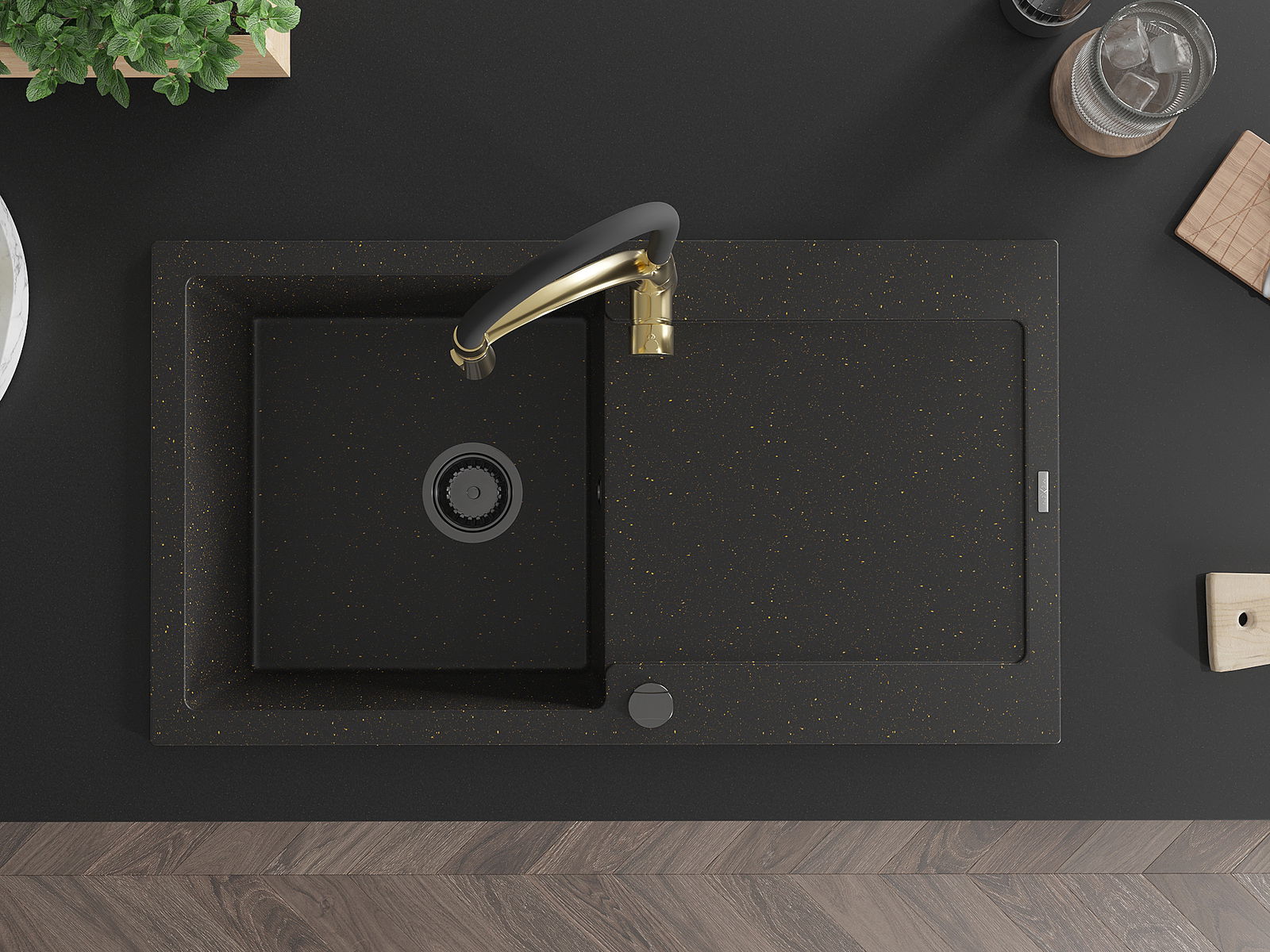 Mexen Leo granitový dřez 1-komorový s odkapávačem a kuchyňskou baterií Aster, černý/zlatý metalik - 6501-75-73450-57-B