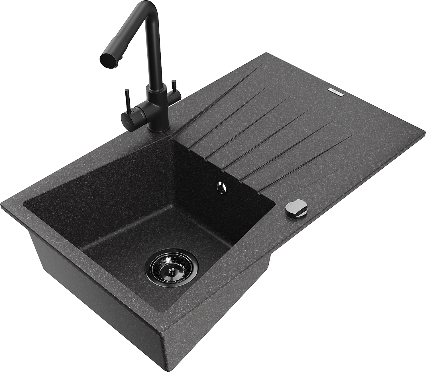 Mexen Cesar granitový dřez 1-komorový s odkapávačem a kuchyňskou baterií Duero, černý skvrnitý - 6514-76-671600-70-B