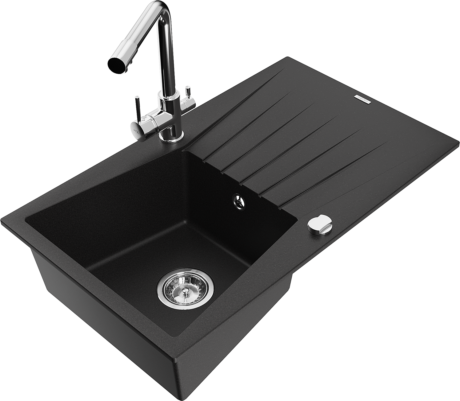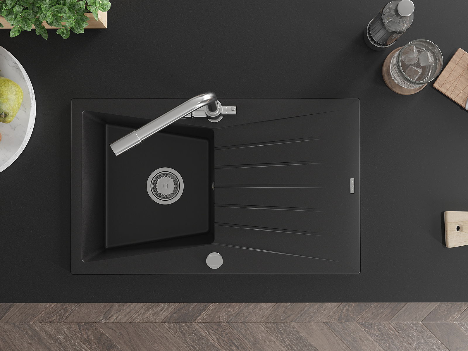 Mexen Cesar granitový dřez 1-komorový s odkapávačem a kuchyňskou baterií Duero, černý - 6514-77-671600-00